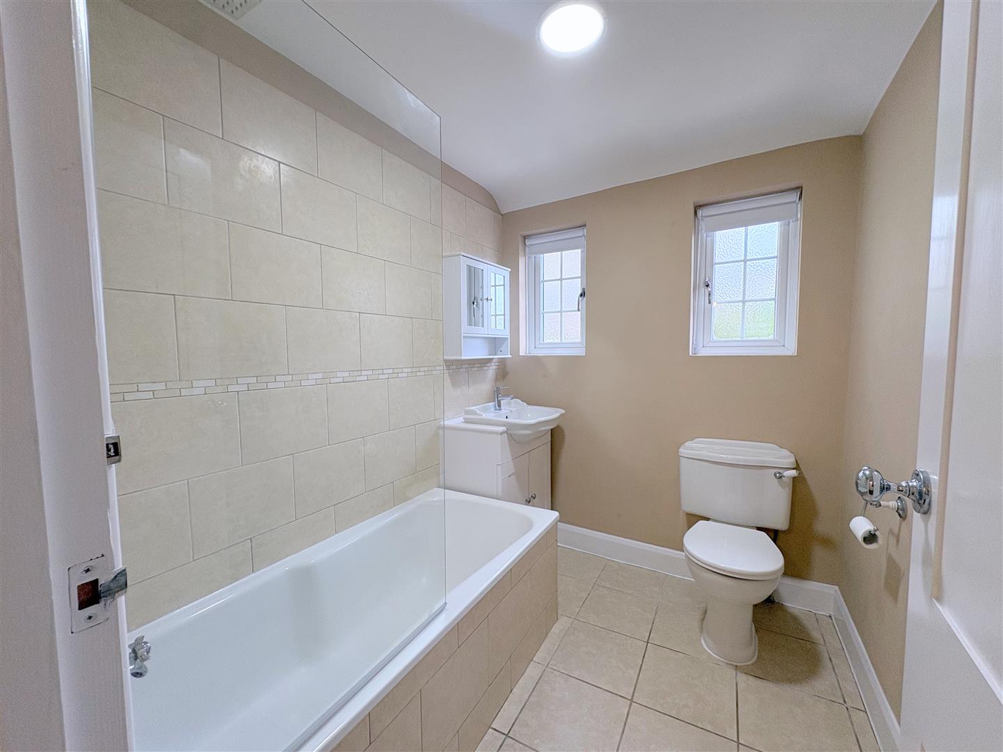 Three piece suite consisting of bath with thermostatic shower, low level flush wc, sink with chrome mixer tap and cupboard below, wall mounted mirrored cupboard, heated towel rail, tiled flooring and part tiled wall, two frosted UPVC double glazed windows with blinds