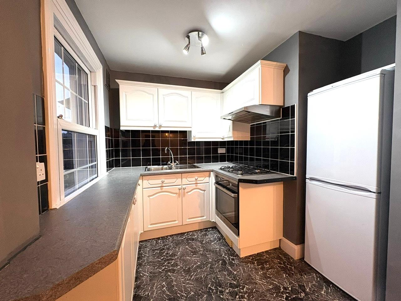 Range of fitted wall units with matching cupboards and drawers below, roll top work surfaces with inlaid stainless steel sink and chrome mixer tap, gas hob with extractor fan above, UPVC sliding sash window
