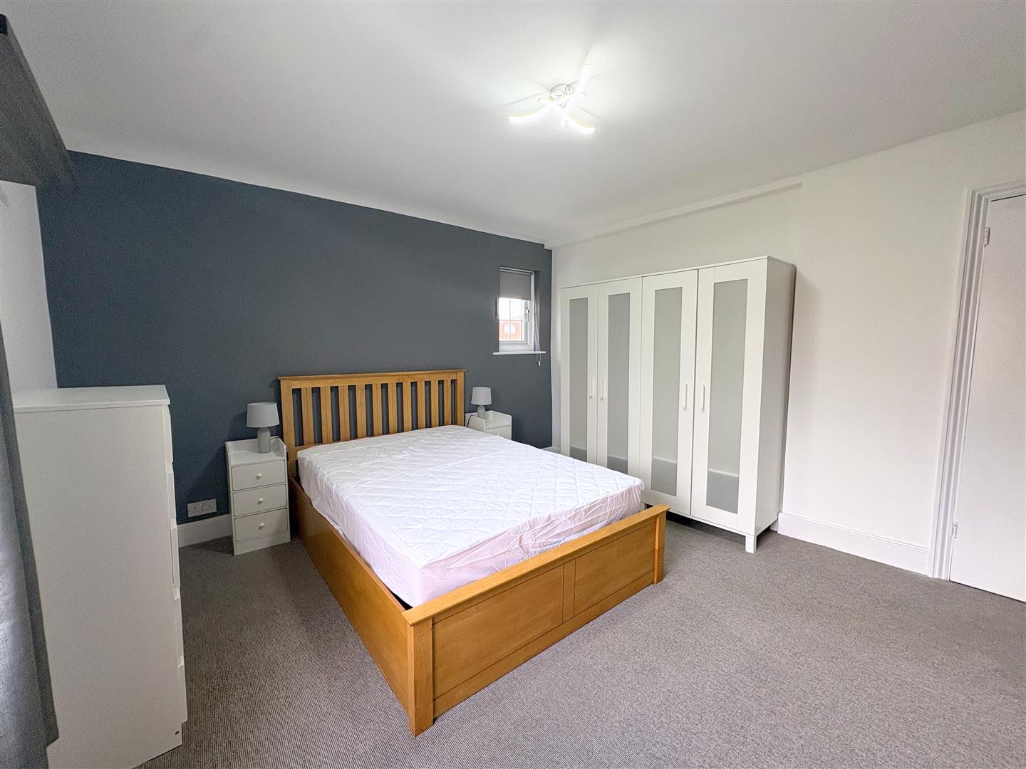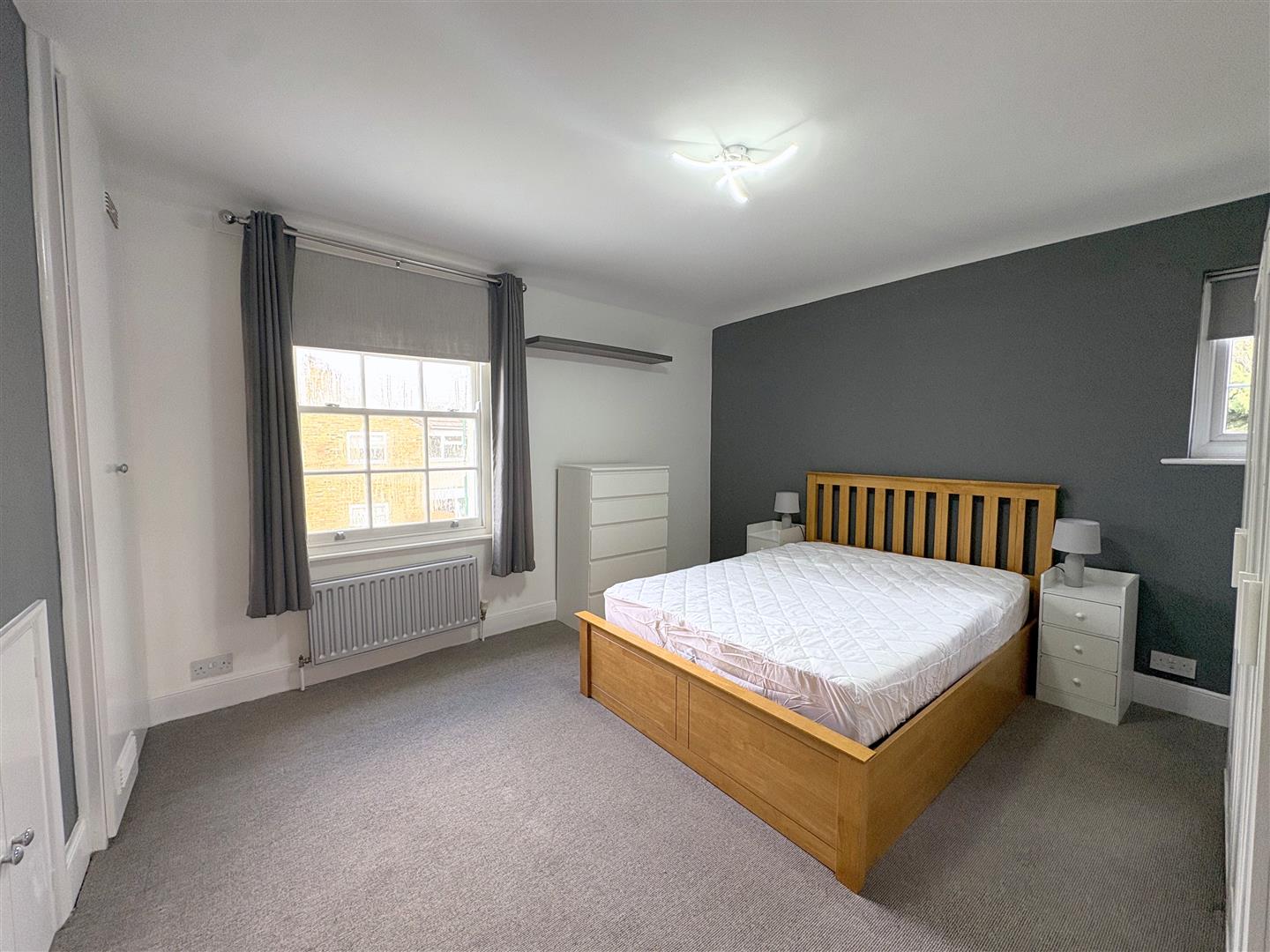 Fitted carpet, UPVC sliding sash windows to front and side aspect with curtains, radiator, storage cupboard
