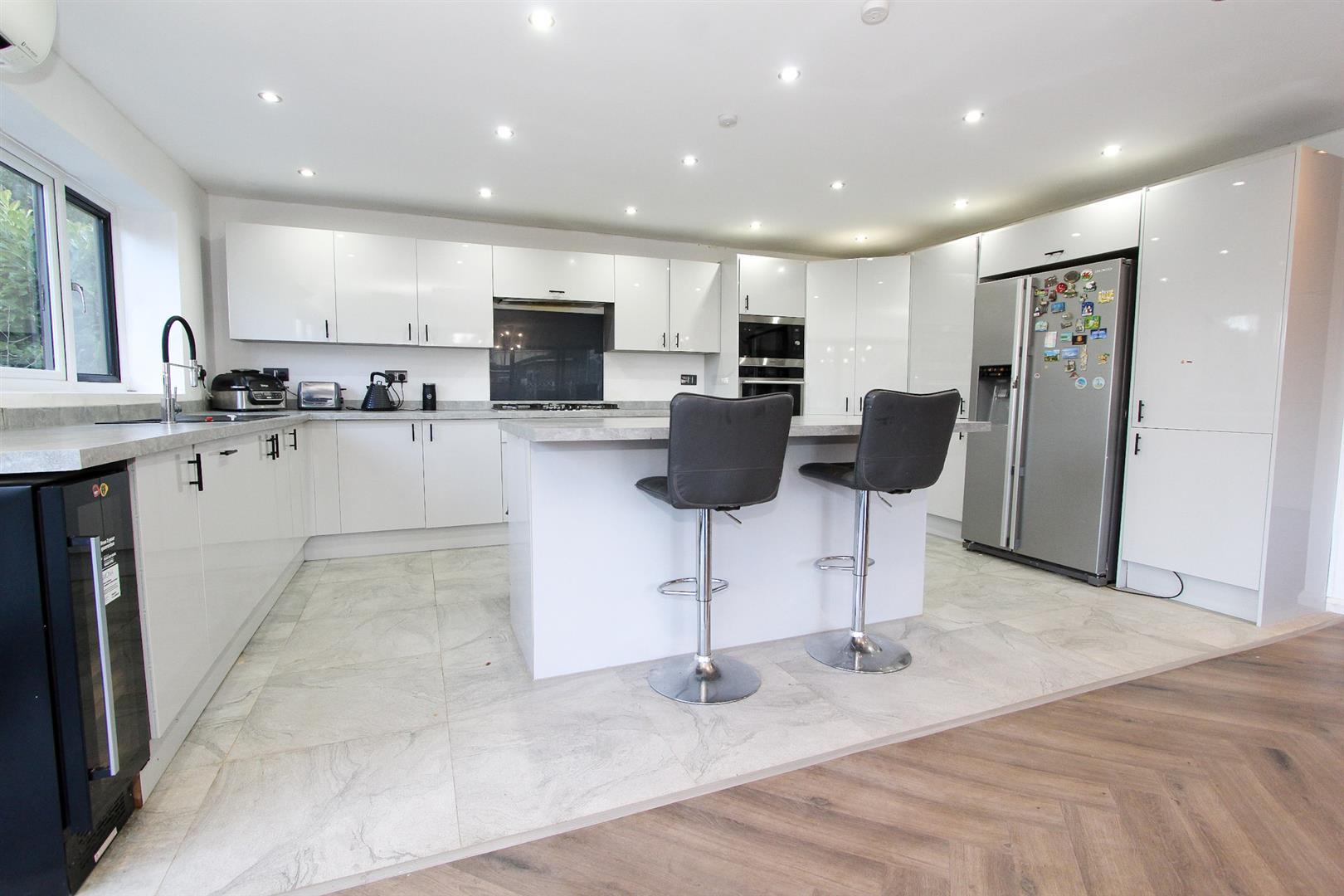 Range of fitted gloss wall units with matching cupboards and drawers below, solid worktops with inlaid sink and chrome mixer tap with hose attachment, integrated dishwasher, integrated oven/grill with microwave above, and laid “Bosch” gas hob with extractor fan above, space for American style fridge/freezer, wine cooler, breakfast bar area, wall mounted air-conditioning unit, UPVC double glazed window to rear aspect.