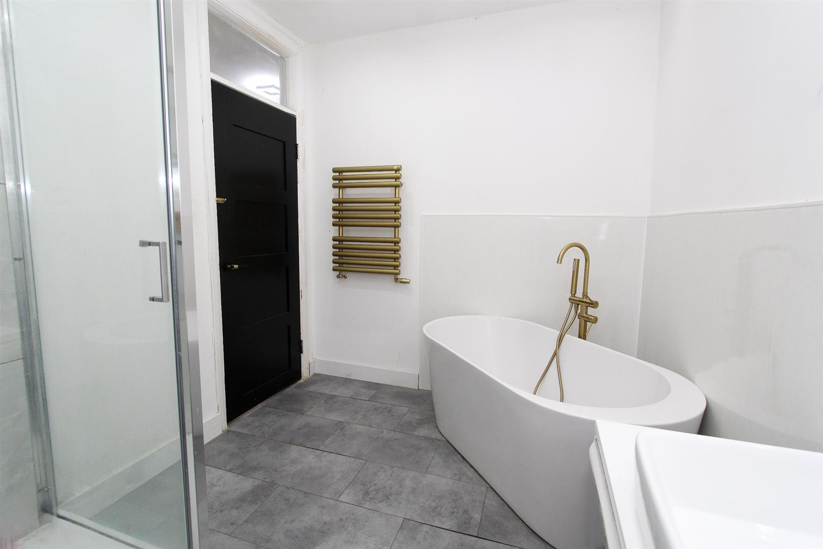 Luxury four piece suite consisting of tiled cubicle with thermostatic shower and hand attachment, freestanding bathtub with mixer tap and shower attachment, wash hand basin with mixer tap and storage cupboards below, low-level push button flush WC, tiled flooring, extractor fan, shaver point.