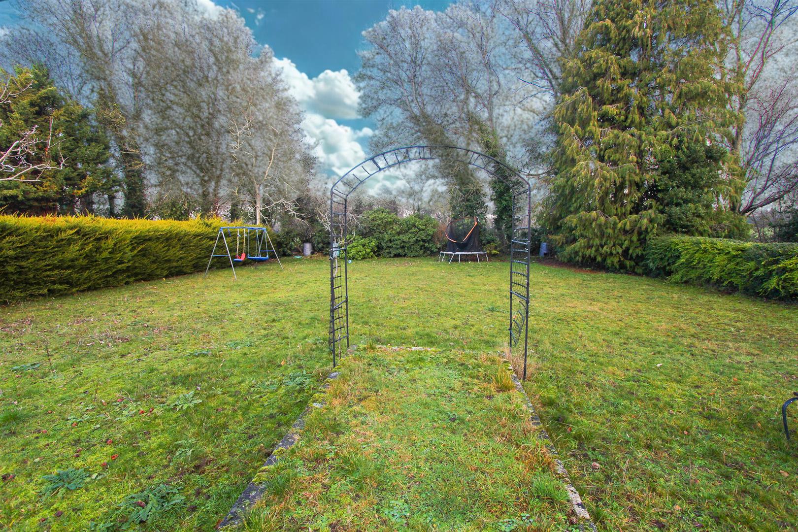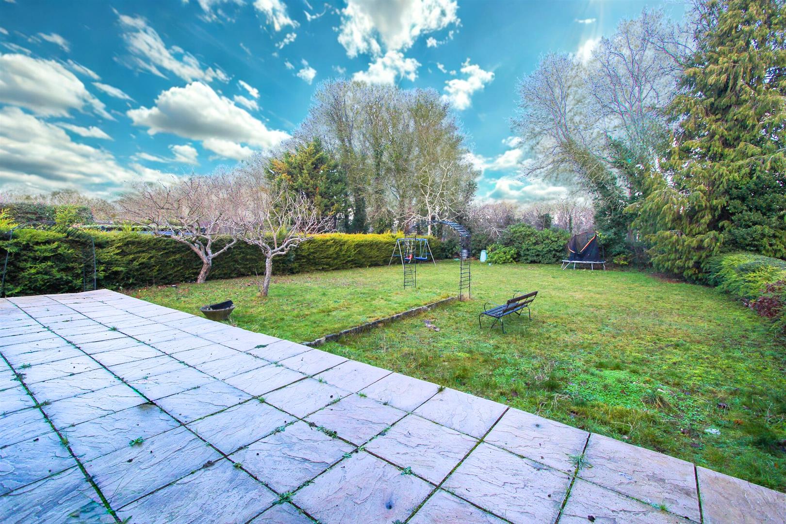Large paved patio area leading to lawn section with mature shrubs and hedges bordering, backing directly onto Cuddington Golf Club, gated side access, outside tap.