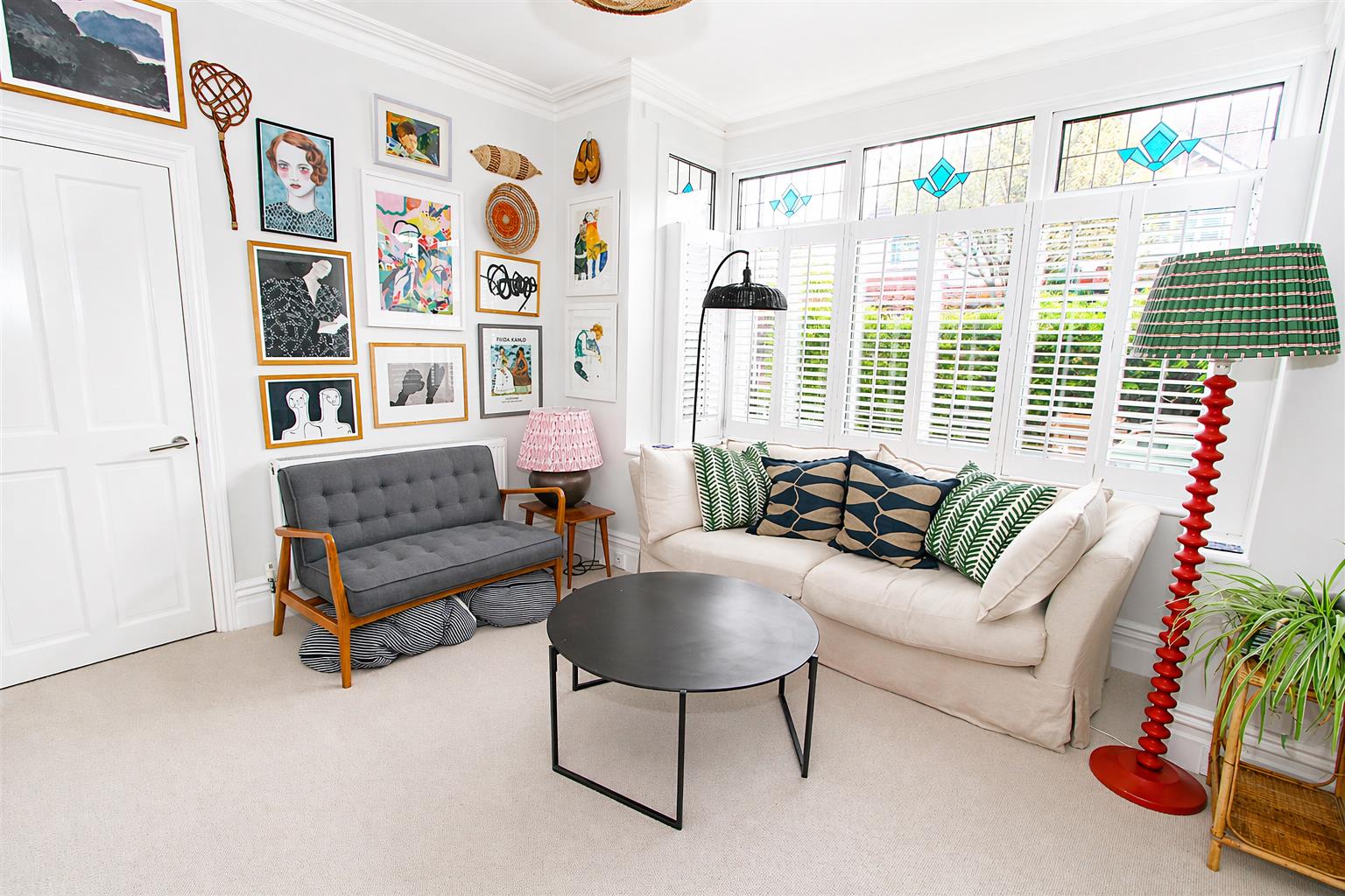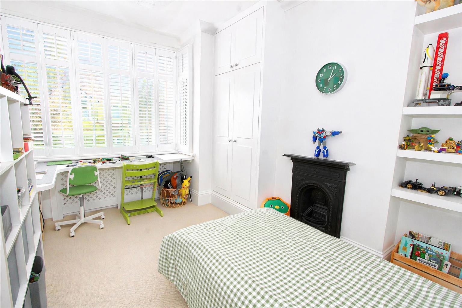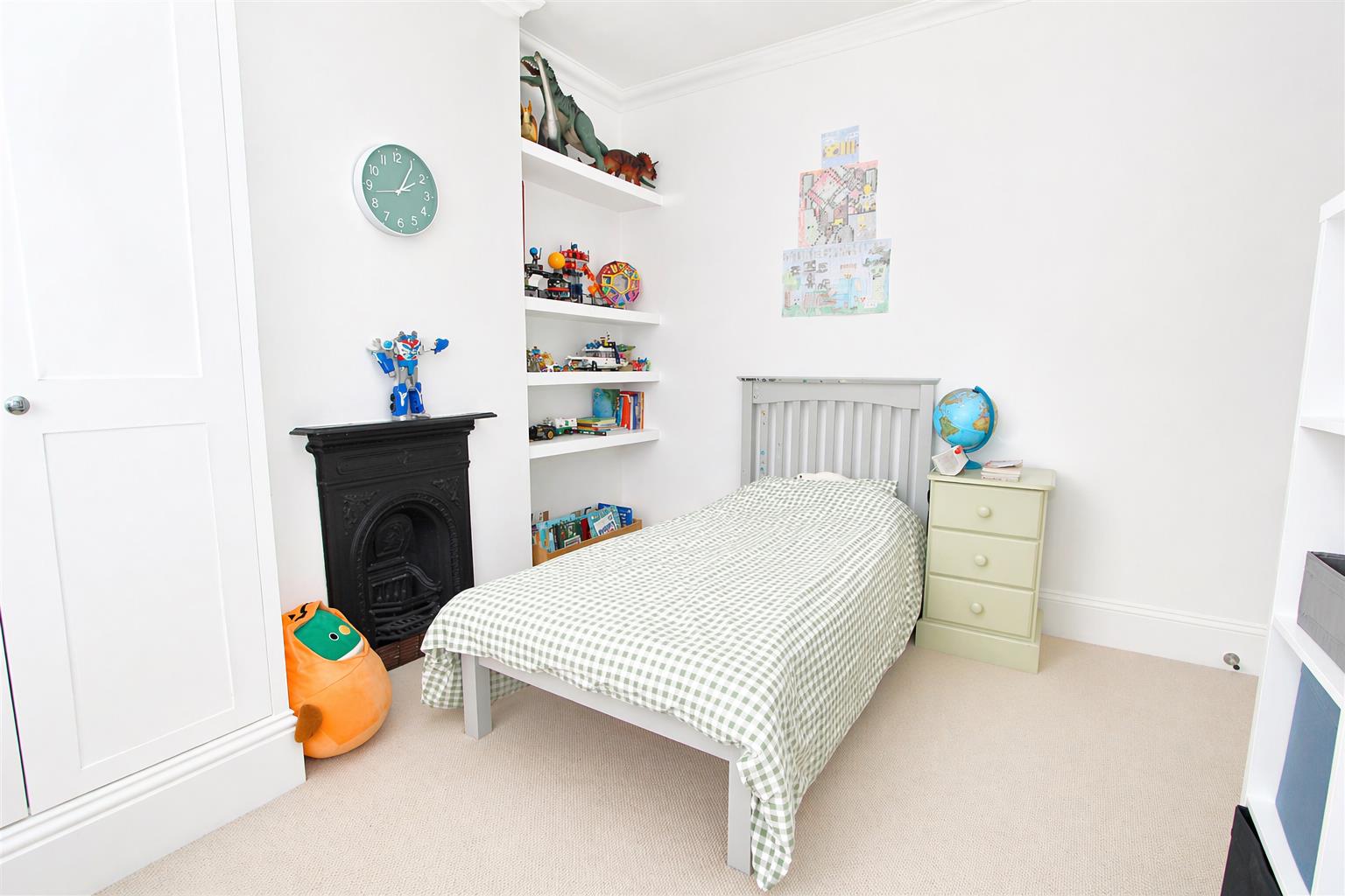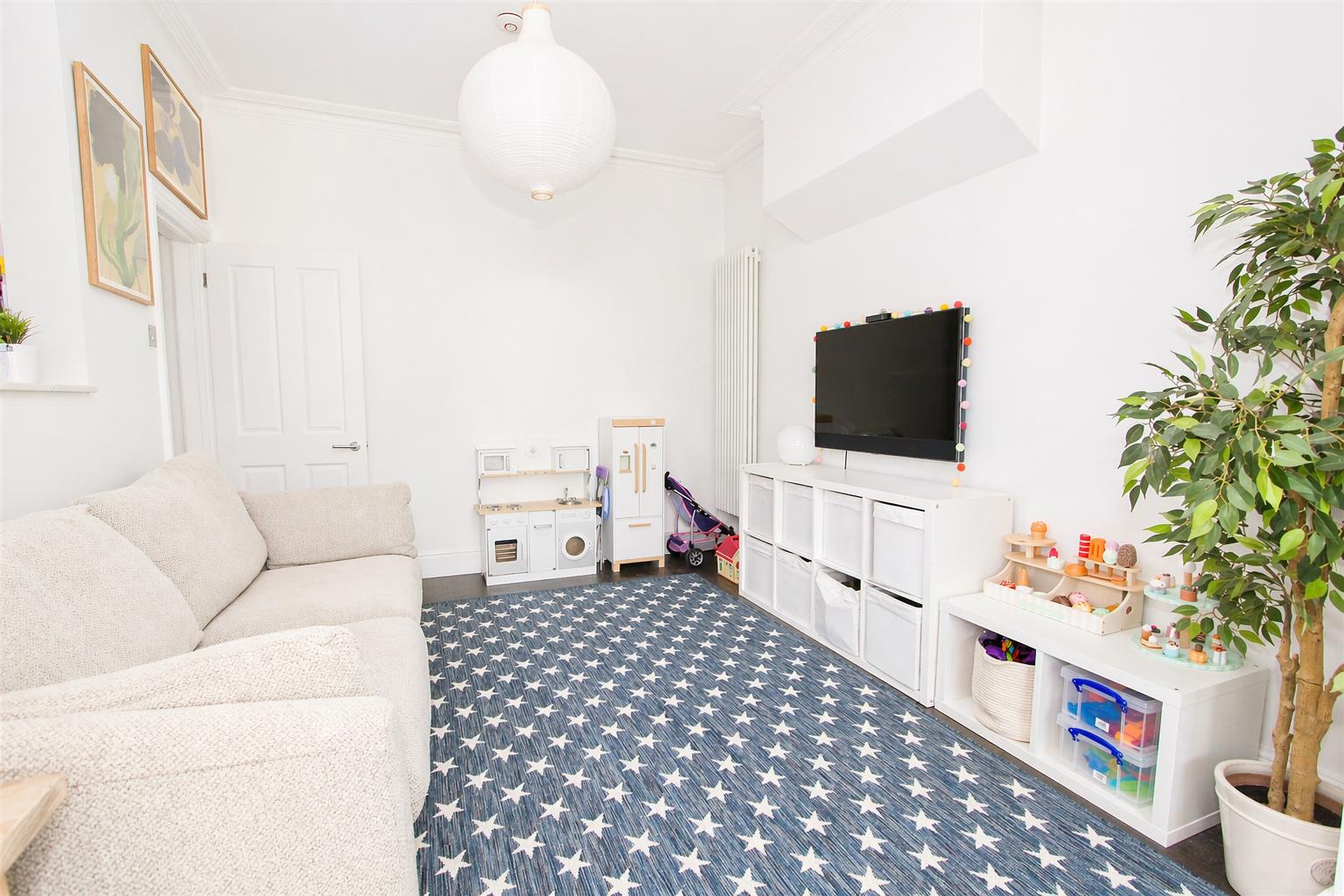 UPVC double glazed bay window to front aspect, fitted plantation shutters, covered radiator, bespoke hanging rails, coved ceiling, feature cast iron fireplace.