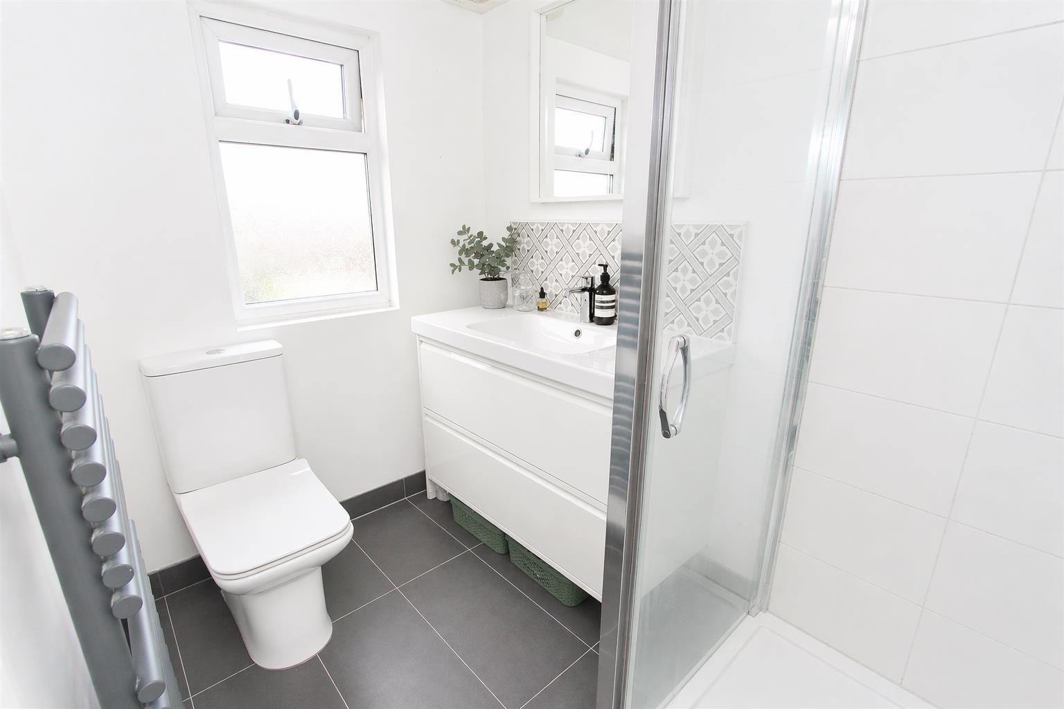 Consisting of tiled cubicle with thermostatic shower and hand attachment, wash hand basin with chrome mixer tap, low-level push button flush WC, tiled flooring, heated towel rail, extractor fan, obscure UPVC double glazed window to rear aspect.
