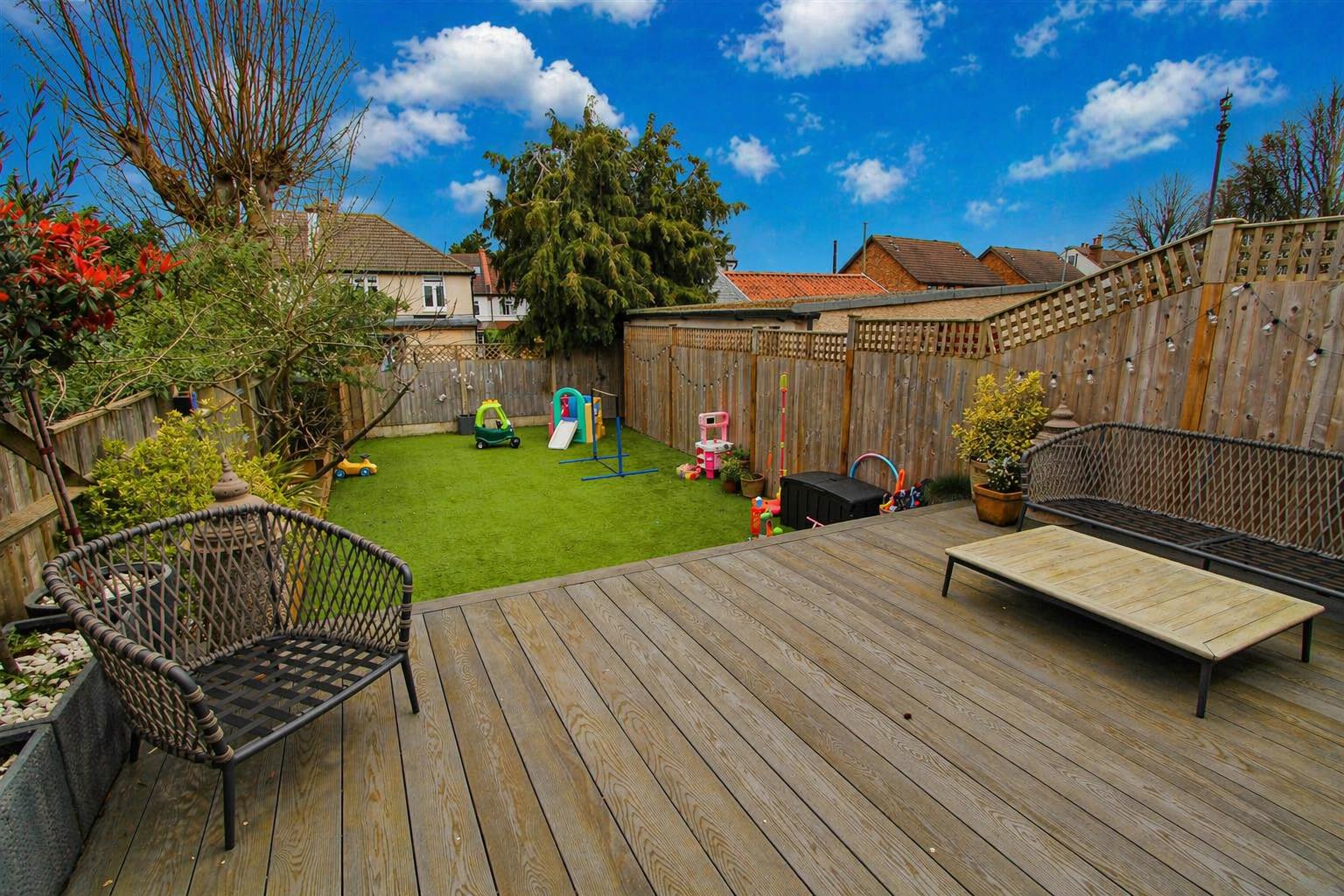 Large composite decking area leading to artificial lawn section with feature timber garden sleeper flowerbeds at side, large wooden storage unit, fence enclosed, rear access.