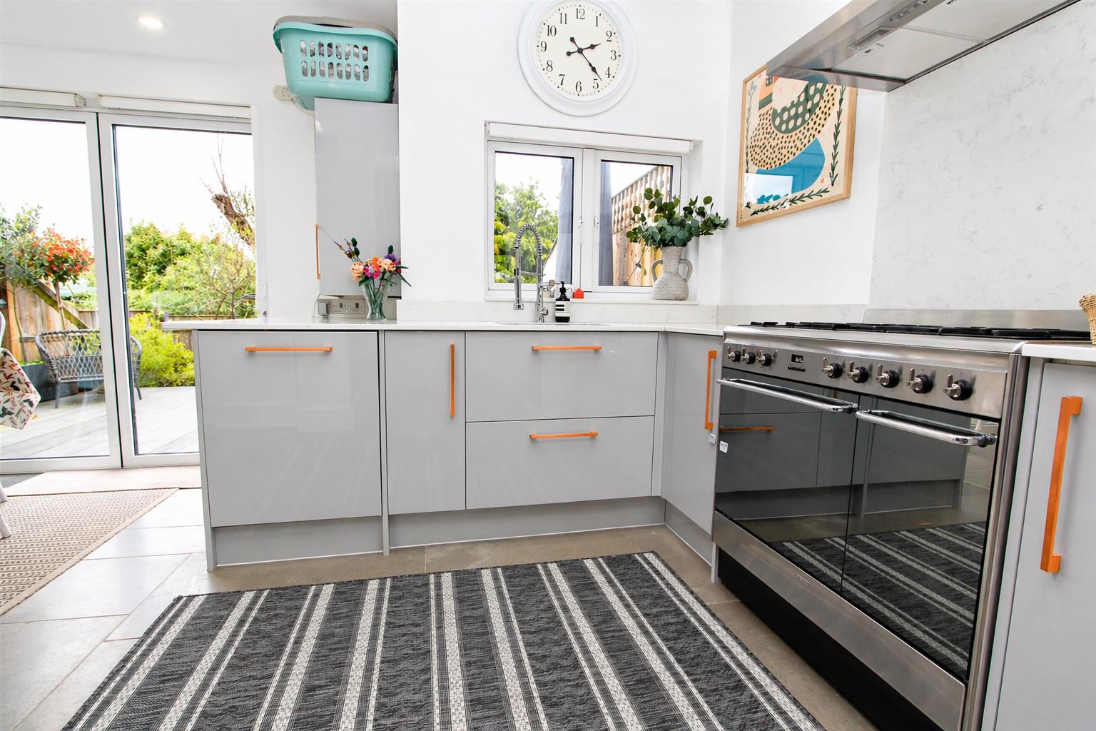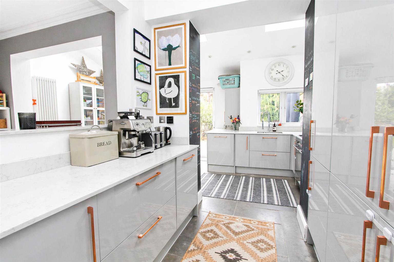 Range of fitted gloss wall units with matching cupboards and drawers below, integrated fridge/freezer, integrated washing machine and dishwasher, cupboard housing mega flow heating system, space for large gas range cooker with extractor fan above, pull out bin storage, inlaid stainless steel sink with chrome mixer tap with hose attachment, tiled flooring, large opening/serving hatch.