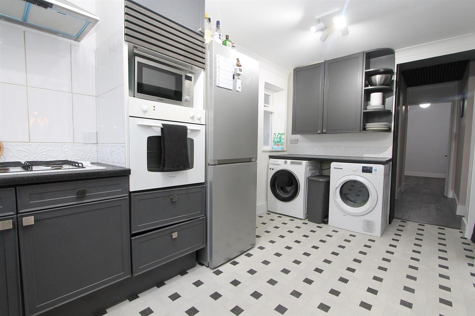 Range of fitted kitchen units and drawers, laminate worktop, inset one and a half bowl sink with chrome mixer tap, integrated oven and gas hob, space for fridge freezer, slimline dishwasher, washing machine and tumble dryer, tiled splashback, double glazed window to rear aspect, double glazed obscure window to side aspect,