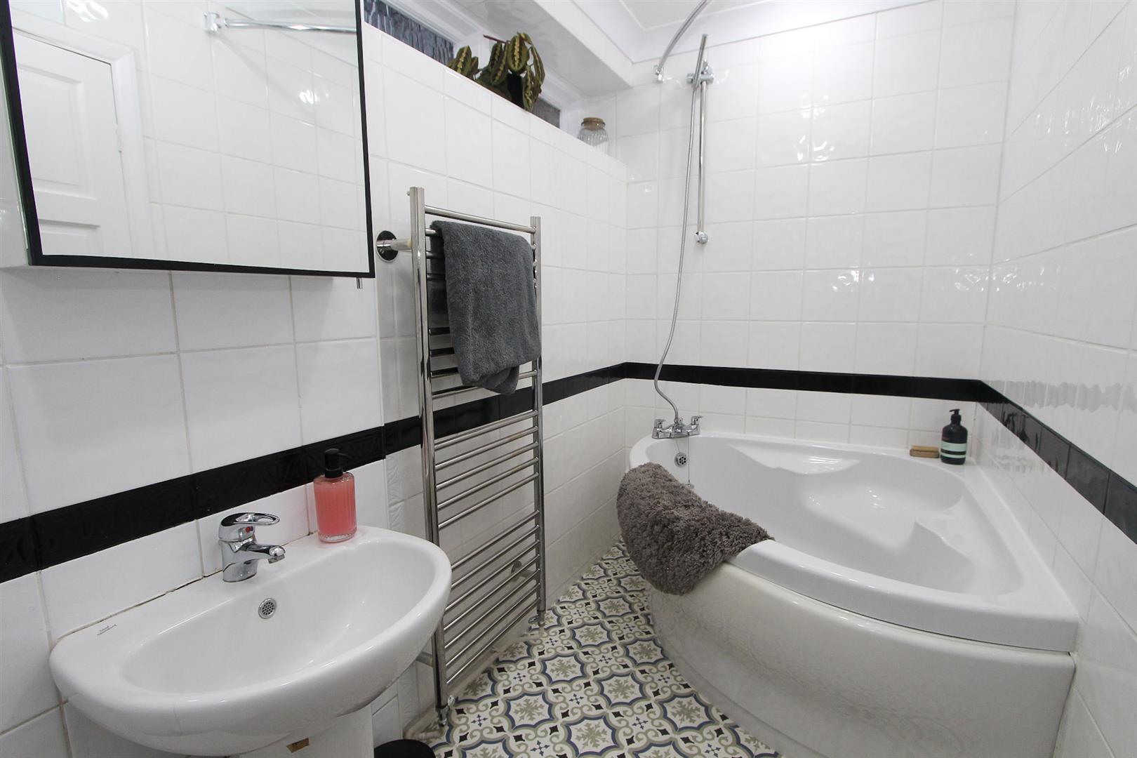Corner bath with chrome mixer tap and shower attachment, pedestal wash hand basin with chrome mixer tap, WC, extractor fan, heated chrome towel rail, vinyl flooring, tiled walls, obscure window to side aspect.