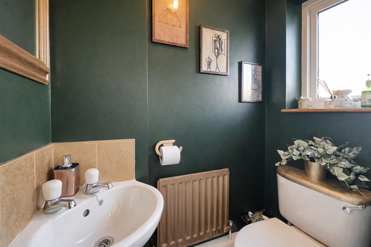 Consisting of low-level push button flush WC, wash hand basin with chrome mixer tap, single panel radiator, obscured double glazed window to front aspect, coved ceiling, tiled flooring.
