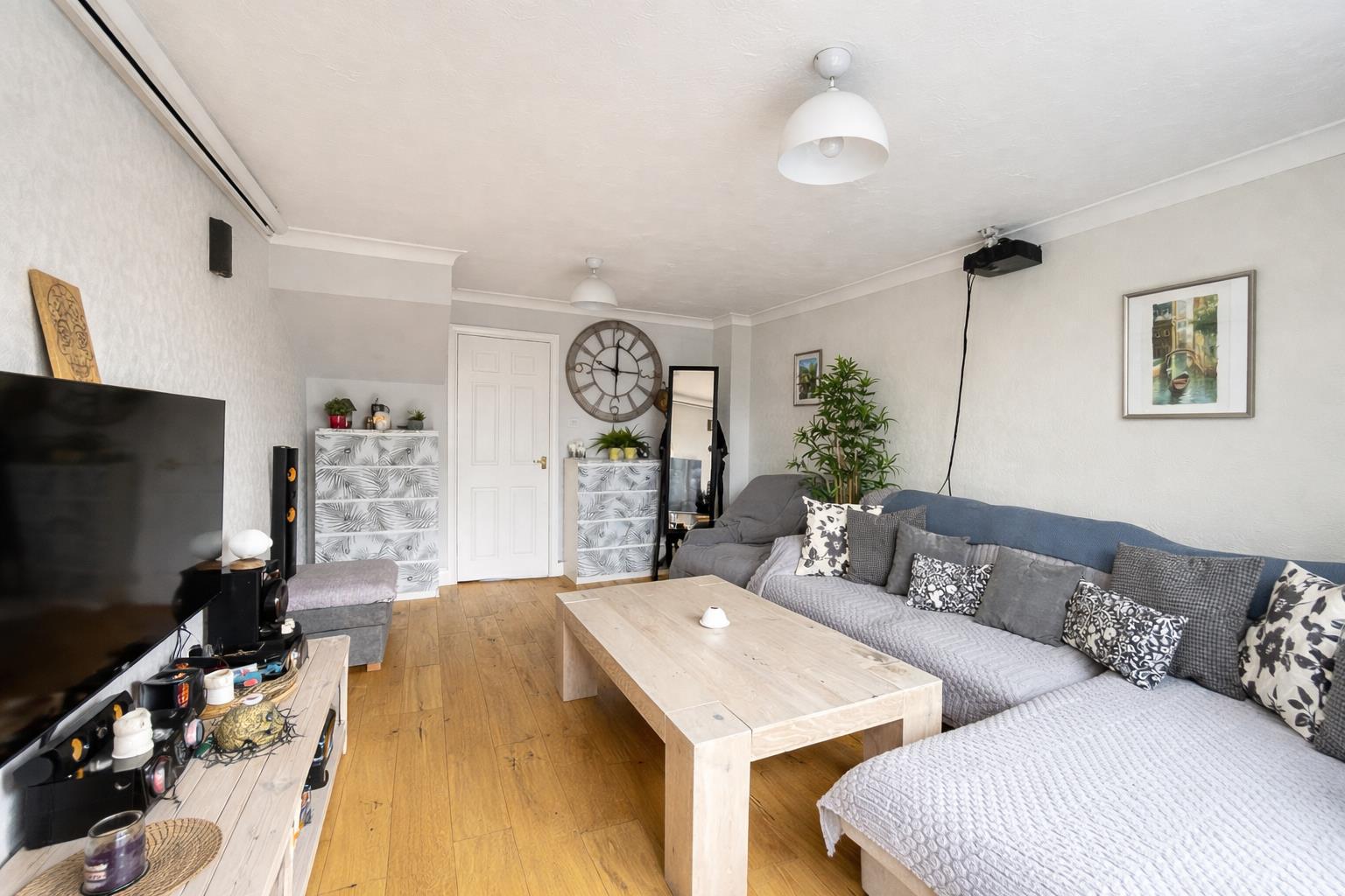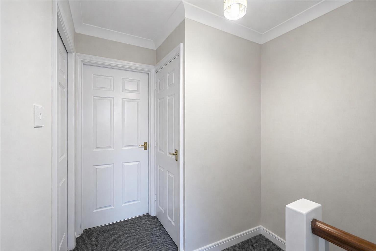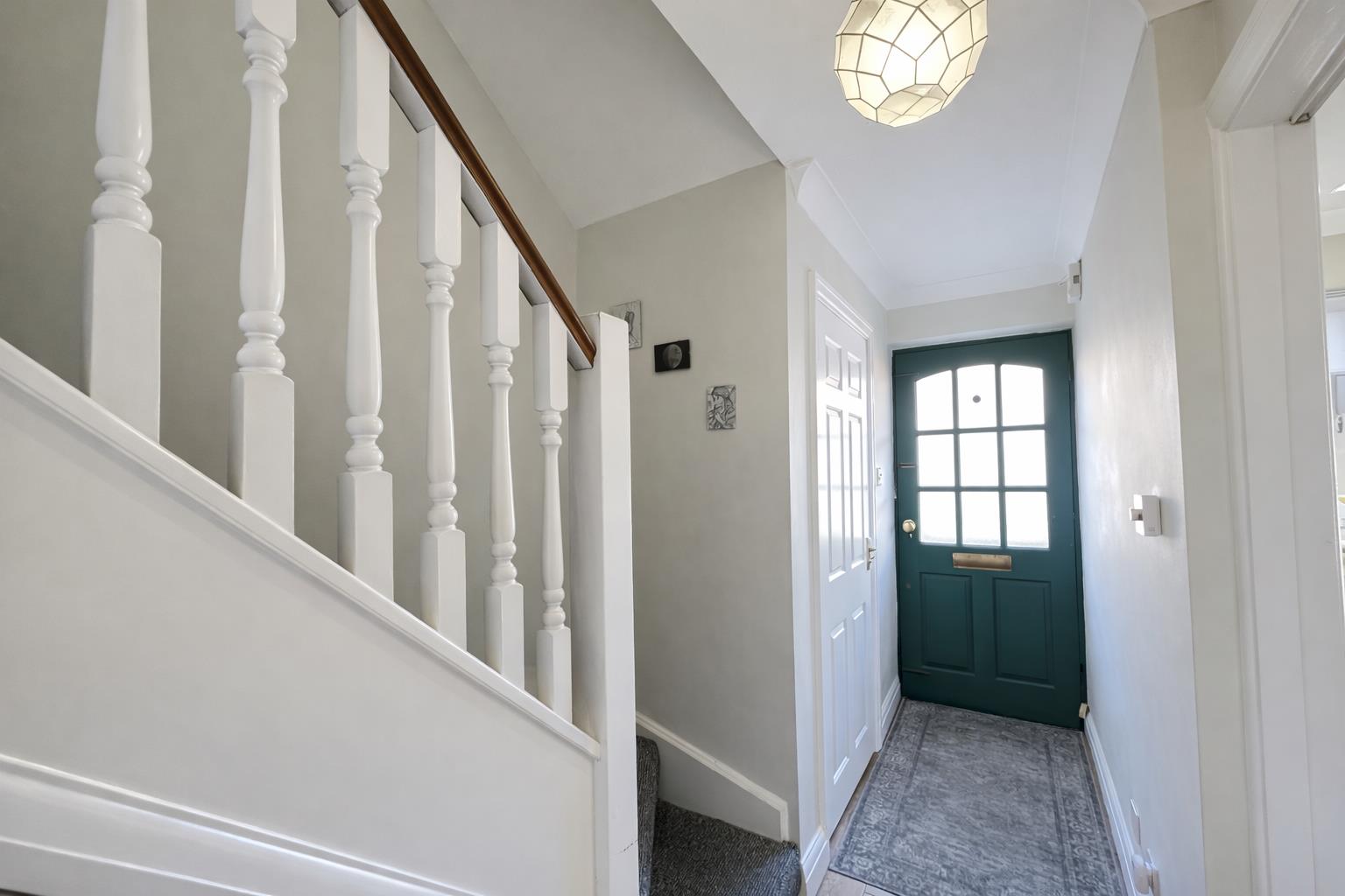 Wood effect flooring, under stairs storage recess, radiator, coved ceiling.