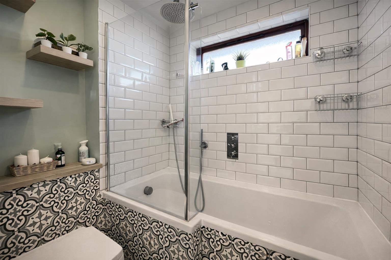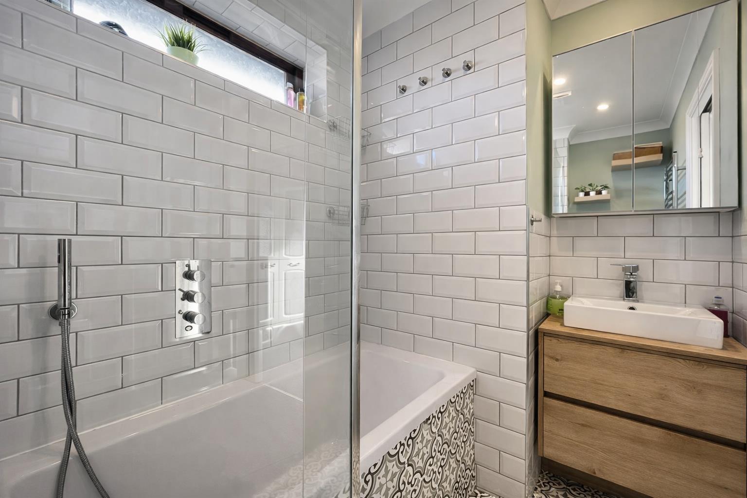 Three-piece suite comprising panel enclosed bath with chrome hand held fixing plus mounted shower, wash hand basin with chrome mixer tap and storage drawers below, low-level push button flush WC, single panel radiator, part tiled walls, vinyl flooring, coved ceiling, extractor fan, double glazed window