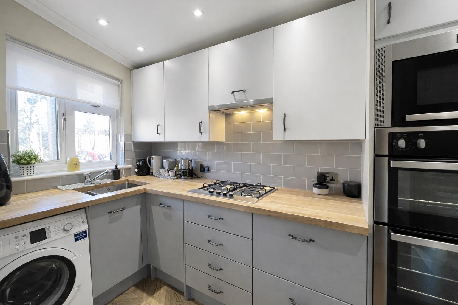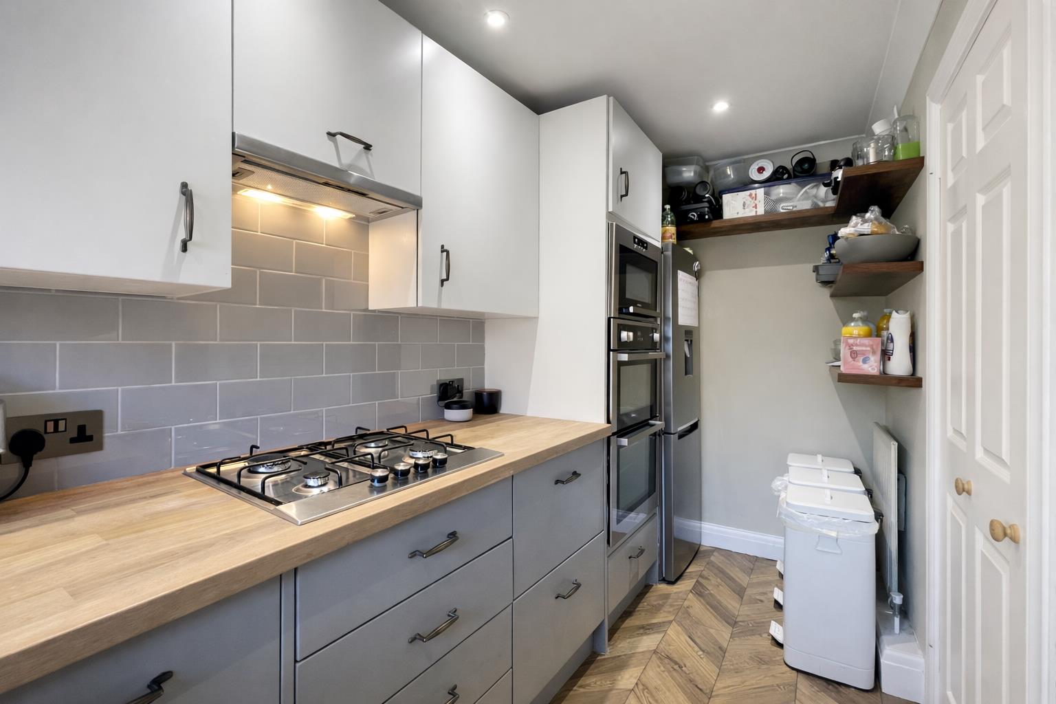 Range fitted wall units with matching cupboards and drawers below, wood effect roll top work surfaces with inlaid stainless steel sink and chrome tap, inset four ring gas hob with extractor fan above and oven/grill below, space for dishwasher, space for fridge/freezer, space and plumbing for washing machine, tiled splash back, wood effect flooring, wall mounted boiler, coved ceiling, single panel radiator, double glazed window to front aspect.