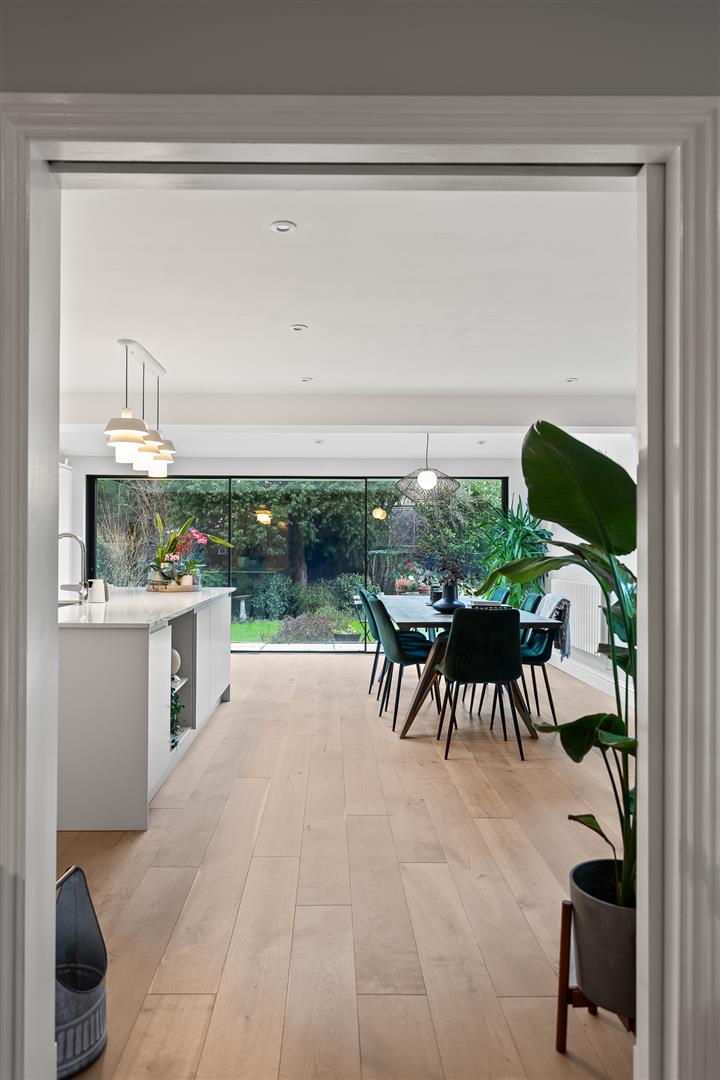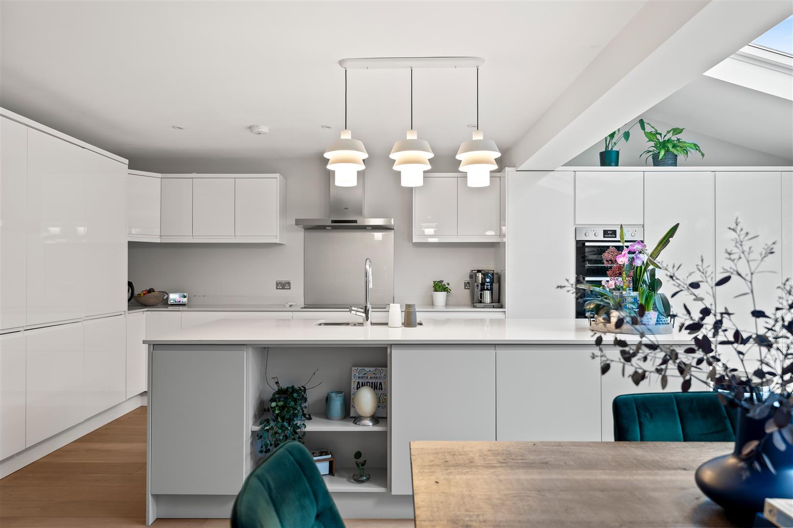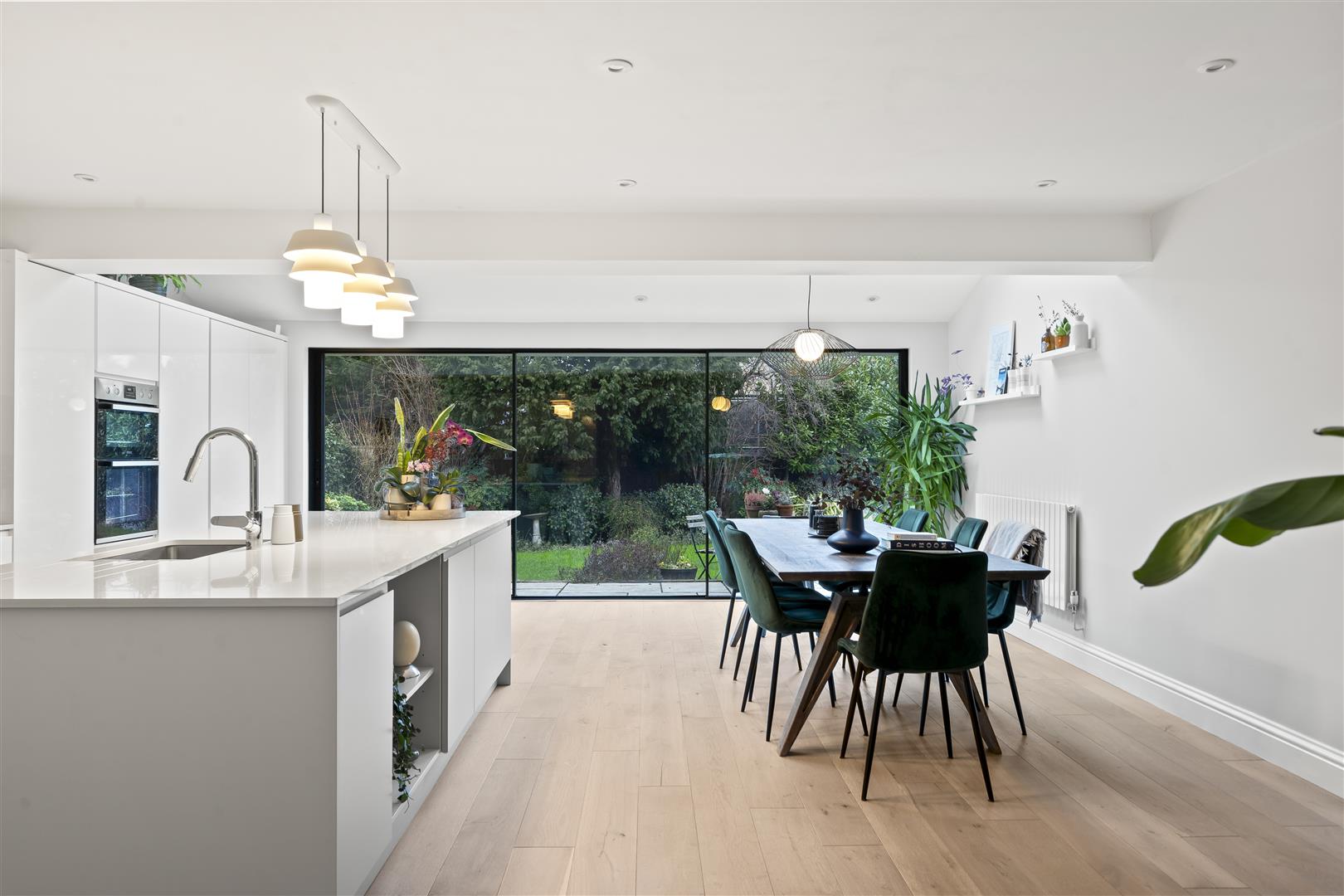Modern fitted kitchen comprising quartz work surfaces with extensive modern range of high gloss drawers and cupboards below with matching wall units with underlighting and range of larder units, integrated built-in double fridge and double freezer below, integrated dishwasher, built-in eye-level double oven, integrated whirlpool induction hob, stainless steel one and a half bowl, Franke under sink with modern Hansgrohe chrome mixer tap with pullout shower attachment, large kitchen island with lighting above and breakfast bar area, further cupboards and display shelving, engineered wood flooring, wall of Cortizo aluminium double glazed sliding doors to garden, wall mounted radiator, three UPVC Velux windows, ceiling downlights, further wall mounted designer radiator.