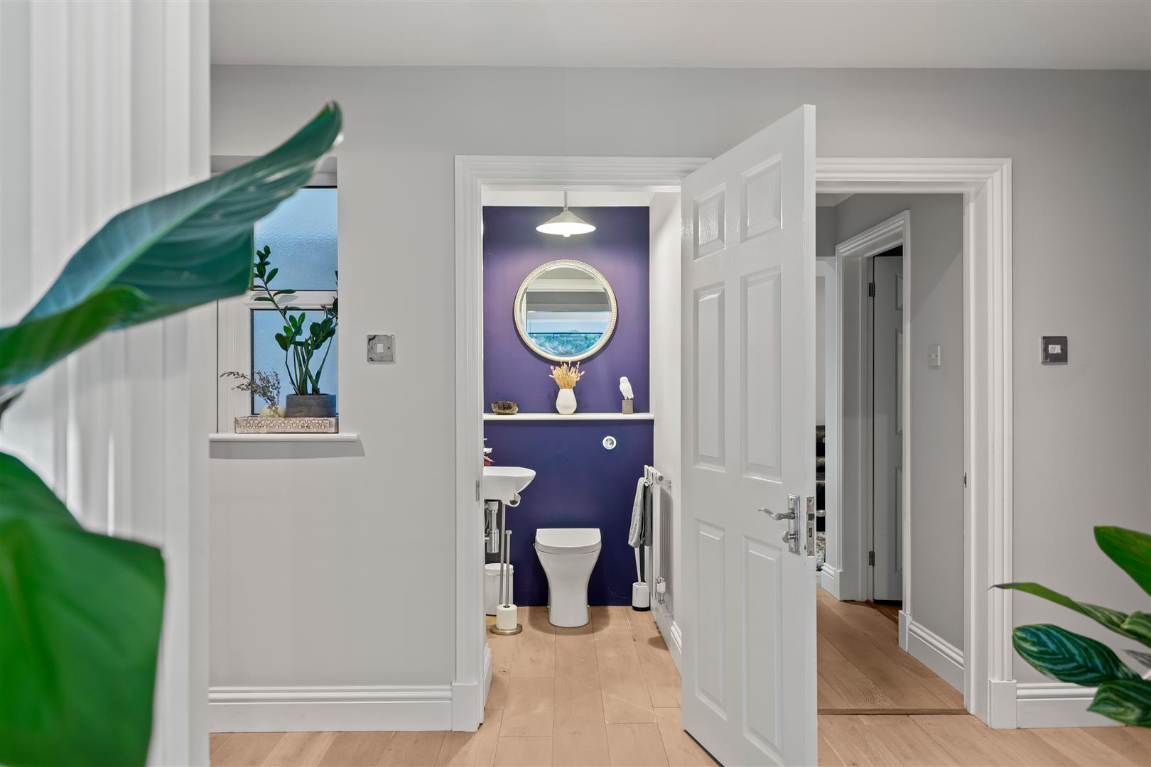 Modern suite comprising low-level WC with concealed cistern, wash hand basin with modern chrome Hansgrohe mixer tap, UPVC double glazed window, engineered wood flooring, radiator, ceiling coving.