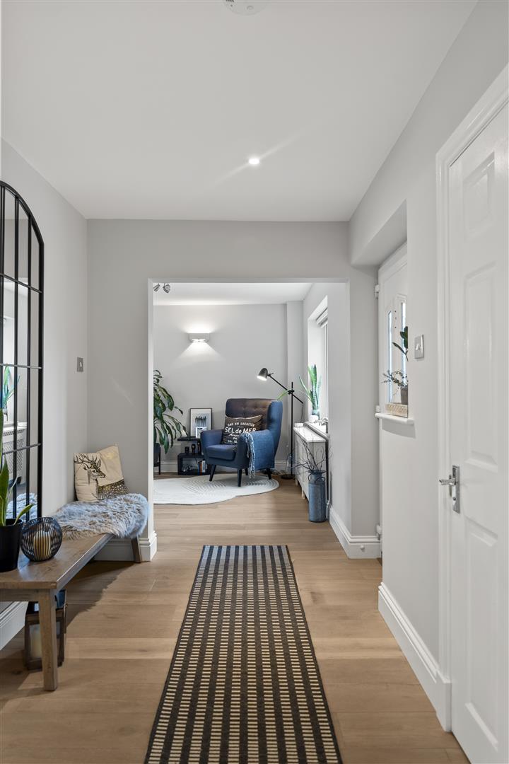 UPVC double glazed window, engineered wood flooring, ceiling coving, downlighting, radiator, door to integral garage and laundry room.