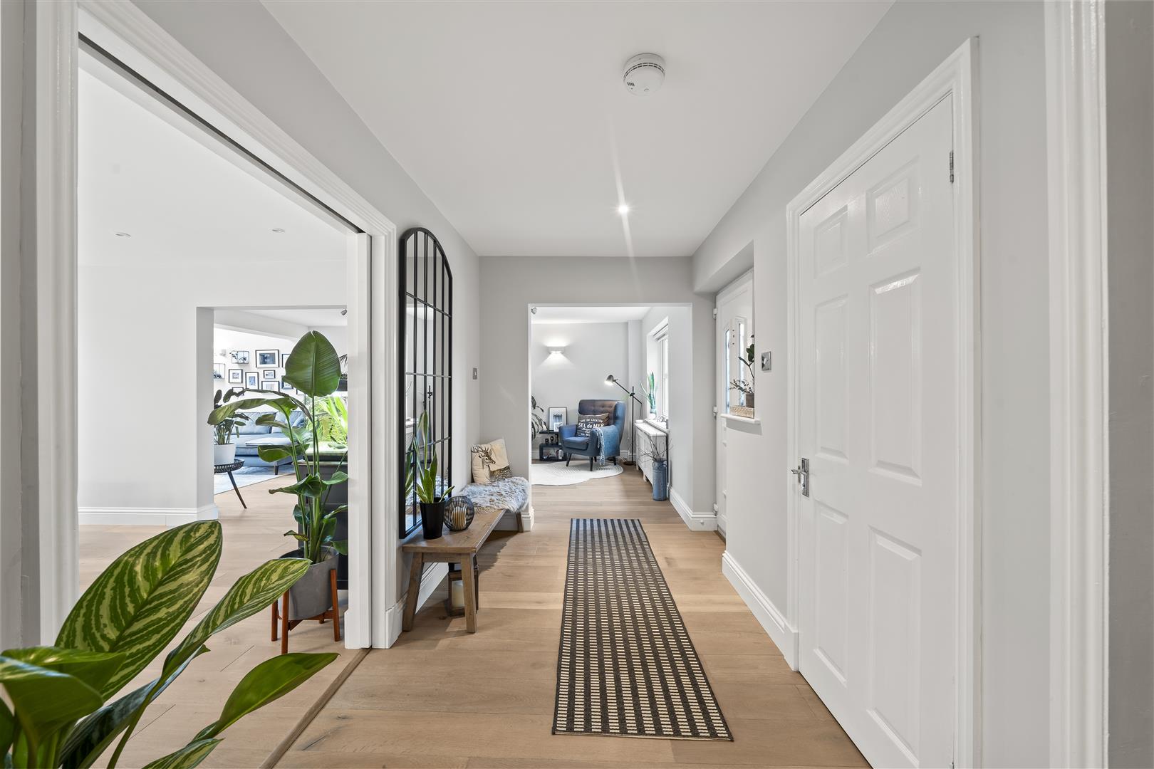 Open plan with wide entrance way to kitchen and lounge, door to office/family room and door to downstairs cloakroom and under stairs storage cupboard, double glazed window, engineered wood flooring, ceiling downlights.