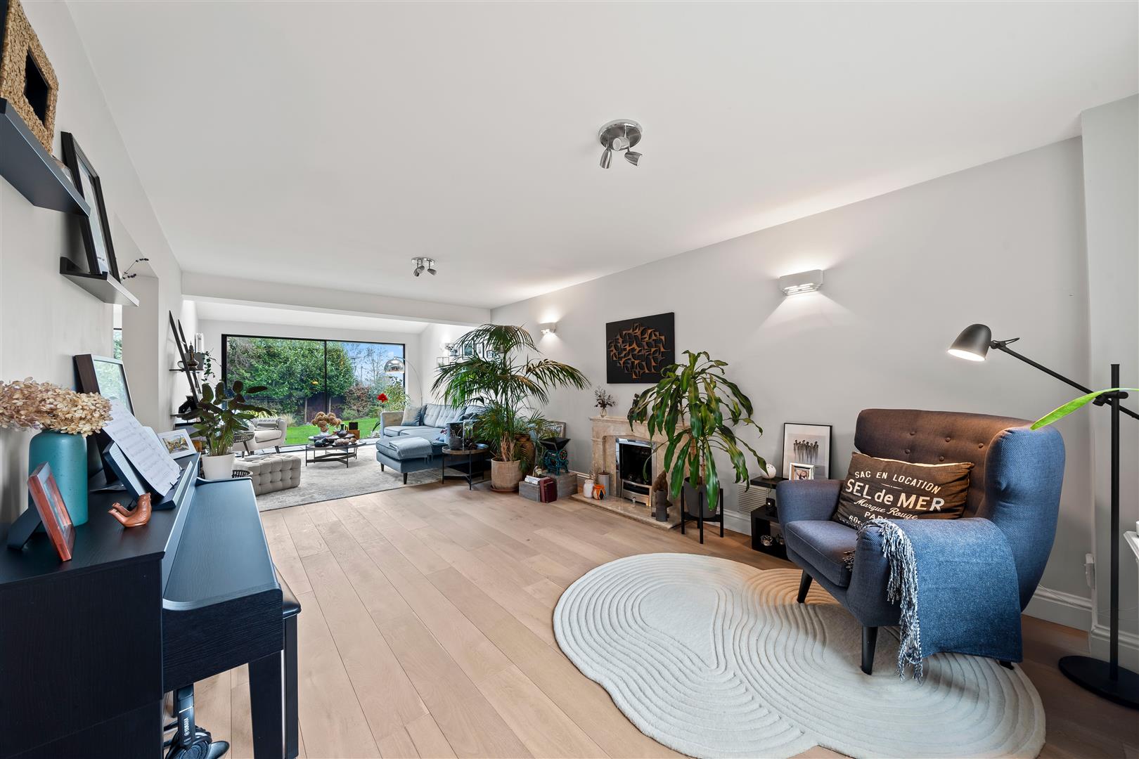 Double glazed Cortizo aluminium double glazed sliding doors to garden, UPVC double glazed window, engineered wood flooring, two UPVC Velux windows, designer wall mounted column radiator, feature fireplace with marble surround and coal effect gas fire insert and matching marble hearth, open plan entrance to..