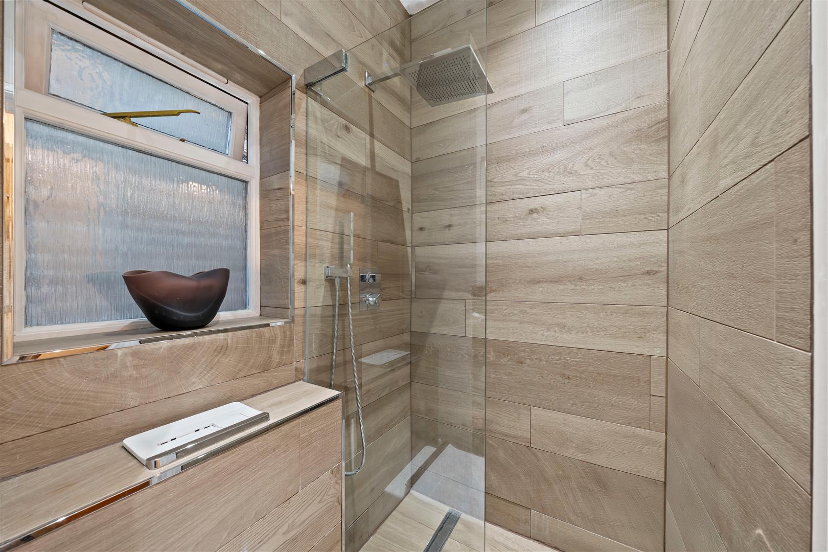 Modern tiled walk-in shower with rain showerhead and hand shower attachment, WC, wash hand basin, double glazed obscure window to side aspect.