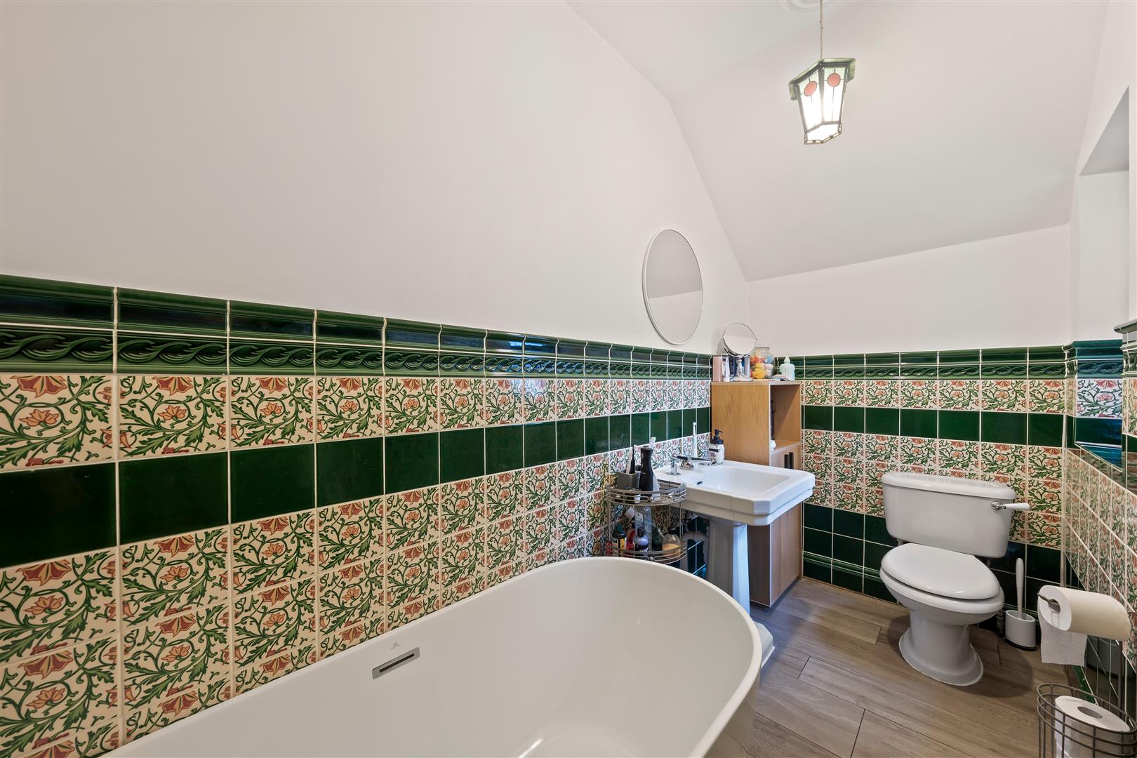Freestanding bath tub with chrome taps, WC, pedestal wash handbasin with chrome tap, part tiled walls, laminate flooring, window to front aspect.