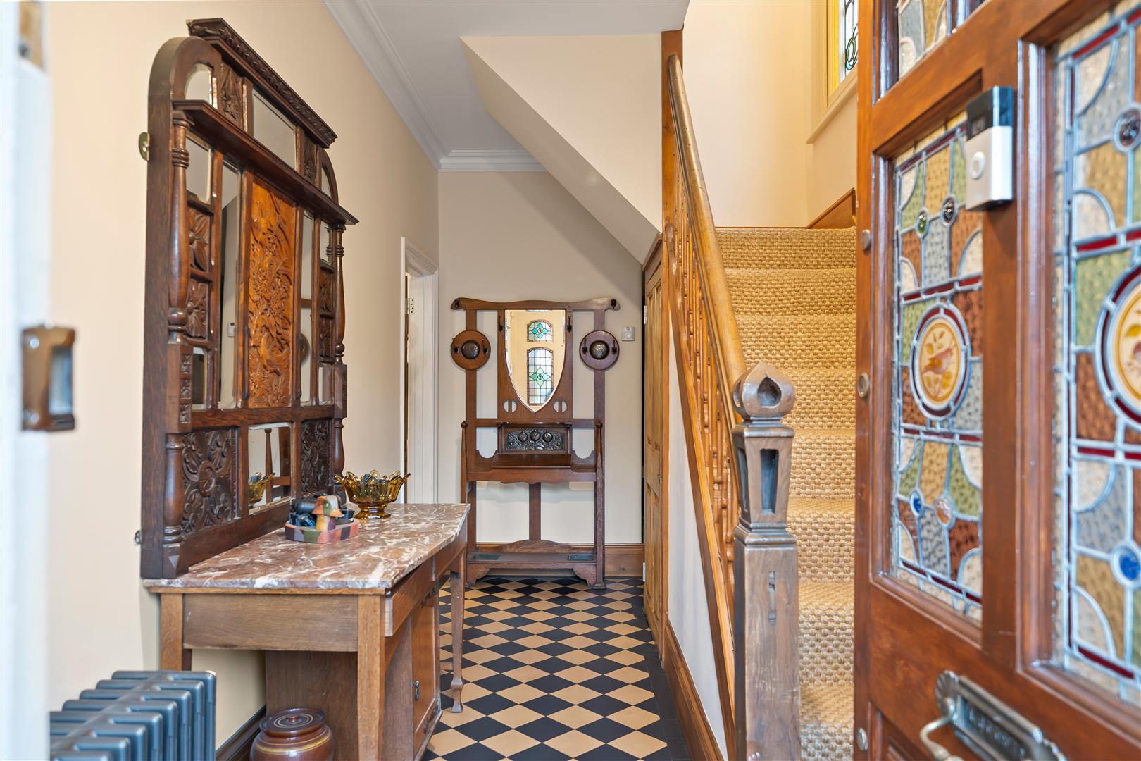 Ornate stained glass front door, radiator, decorative tiled flooring, under stairs storage cupboard.