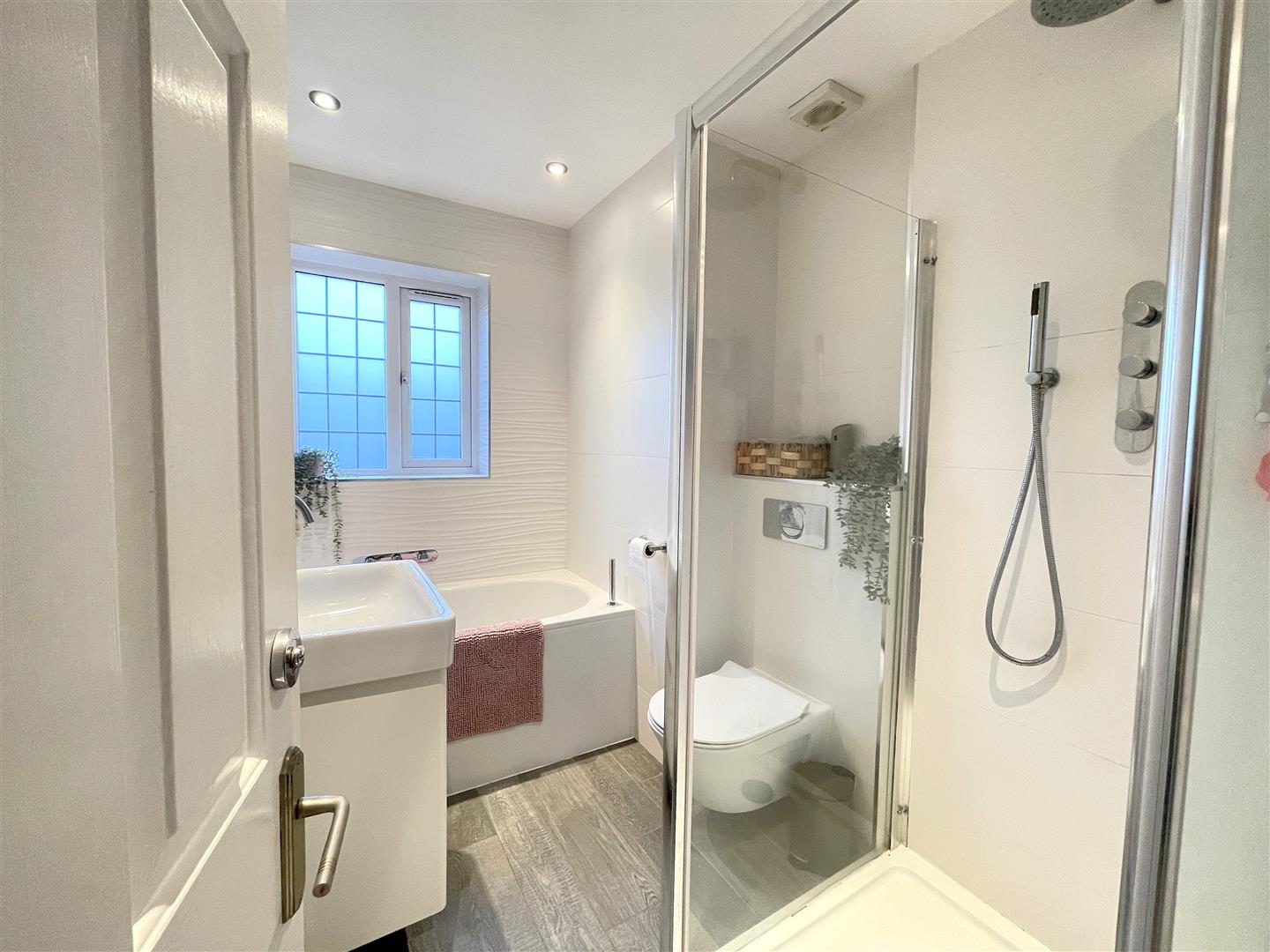 Modern white suite comprising panel enclosed double ended bath with chrome wall mounted tap plate and separate shower attachment, large wash handbasin with modern chrome three-piece tap set and drawers below, large tiled shower cubicle with modern chrome shower fittings, low-level WC with concealed cistern and push button flush, tiled walls with feature tiled wall, UPVC double glazed leaded light window to front aspect, chrome radiator/towel rail, extractor fan.