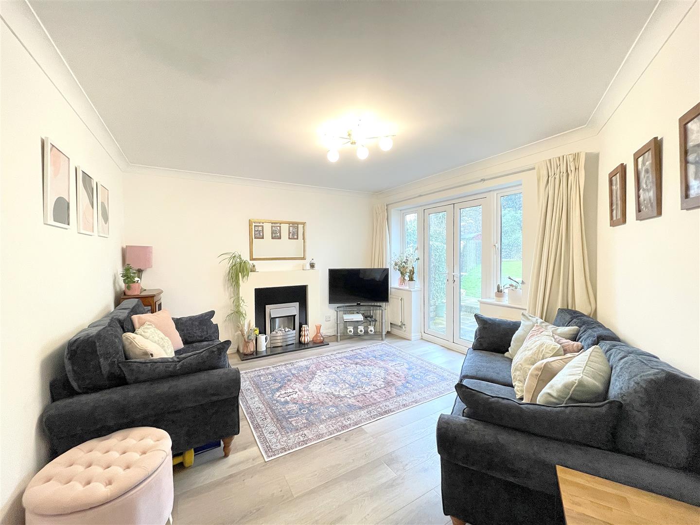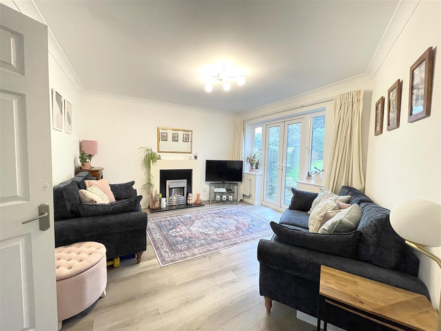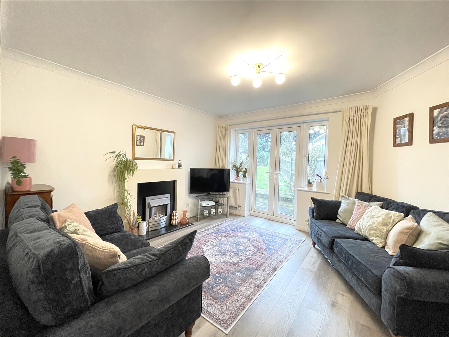 Feature electric fireplace with modern surround and stainless steel and pebble insert with granite hearth, wood effect flooring, UPVC double glazed French doors to garden with windows either side, ceiling coving, radiator.