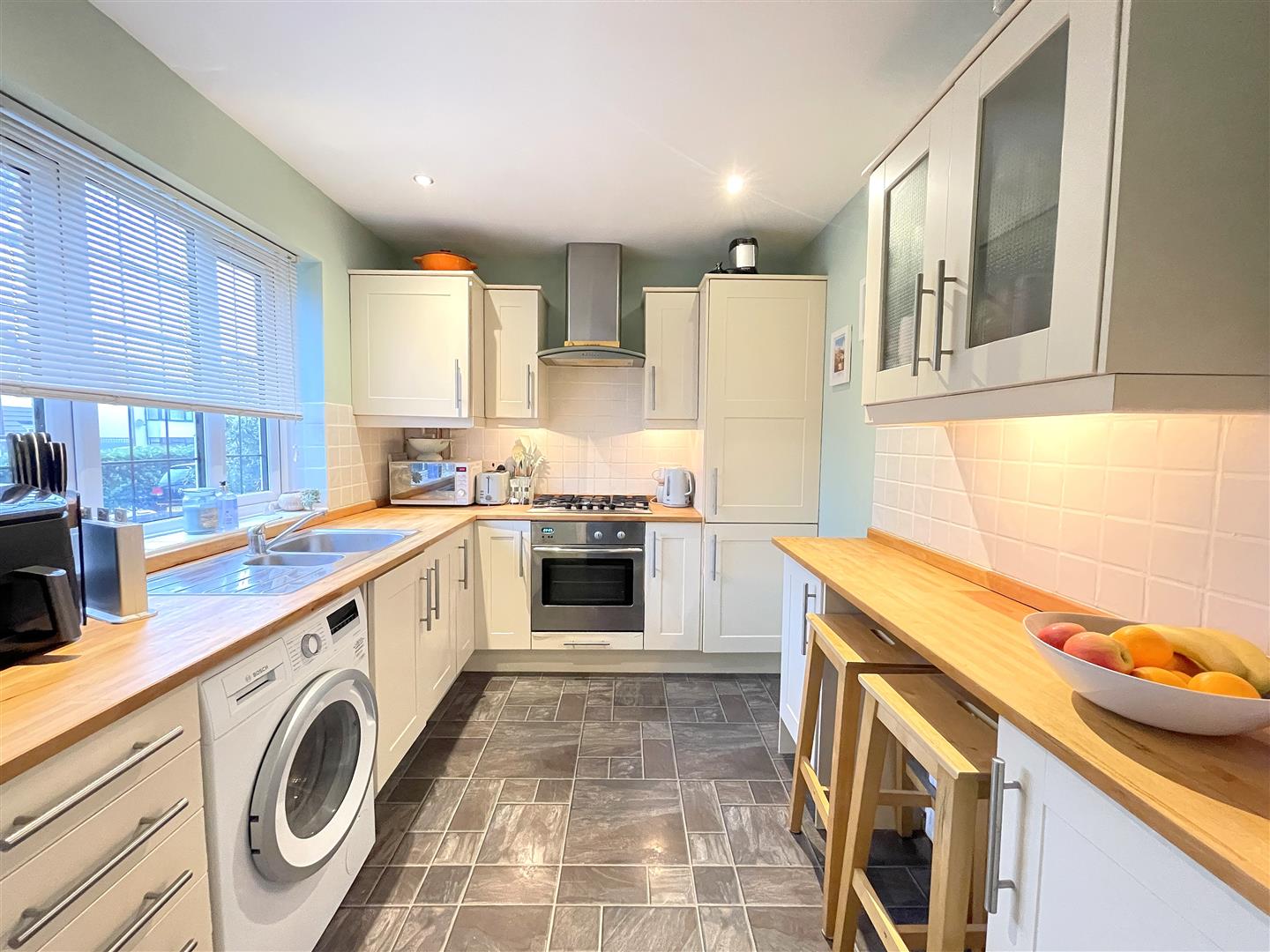 Beechwood worksurfaces with Shaker style modern drawers and cupboards below, matching wall units with under lighting, cupboard housing fridge freezer, 1 1/2 bowl stainless steel sink with modern chrome mixer tap, built-in stainless steel oven with five ring gas hob and stainless steel and glass cooker hood above, breakfast bar area, part tiled walls and tile effect laminate flooring, UPVC double glazed leaded light window to front aspect, radiator.