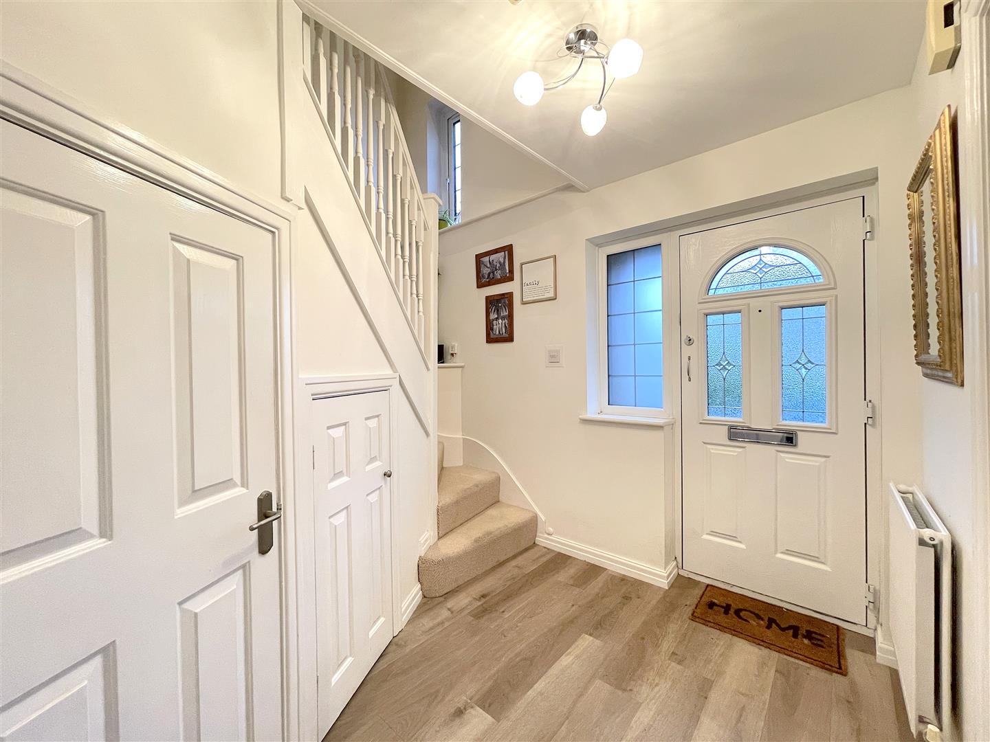 Two large under stairs storage cupboards, wood effect flooring, UPVC double glazed leaded light window to front aspect, radiator. Doors to kitchen and lounge.