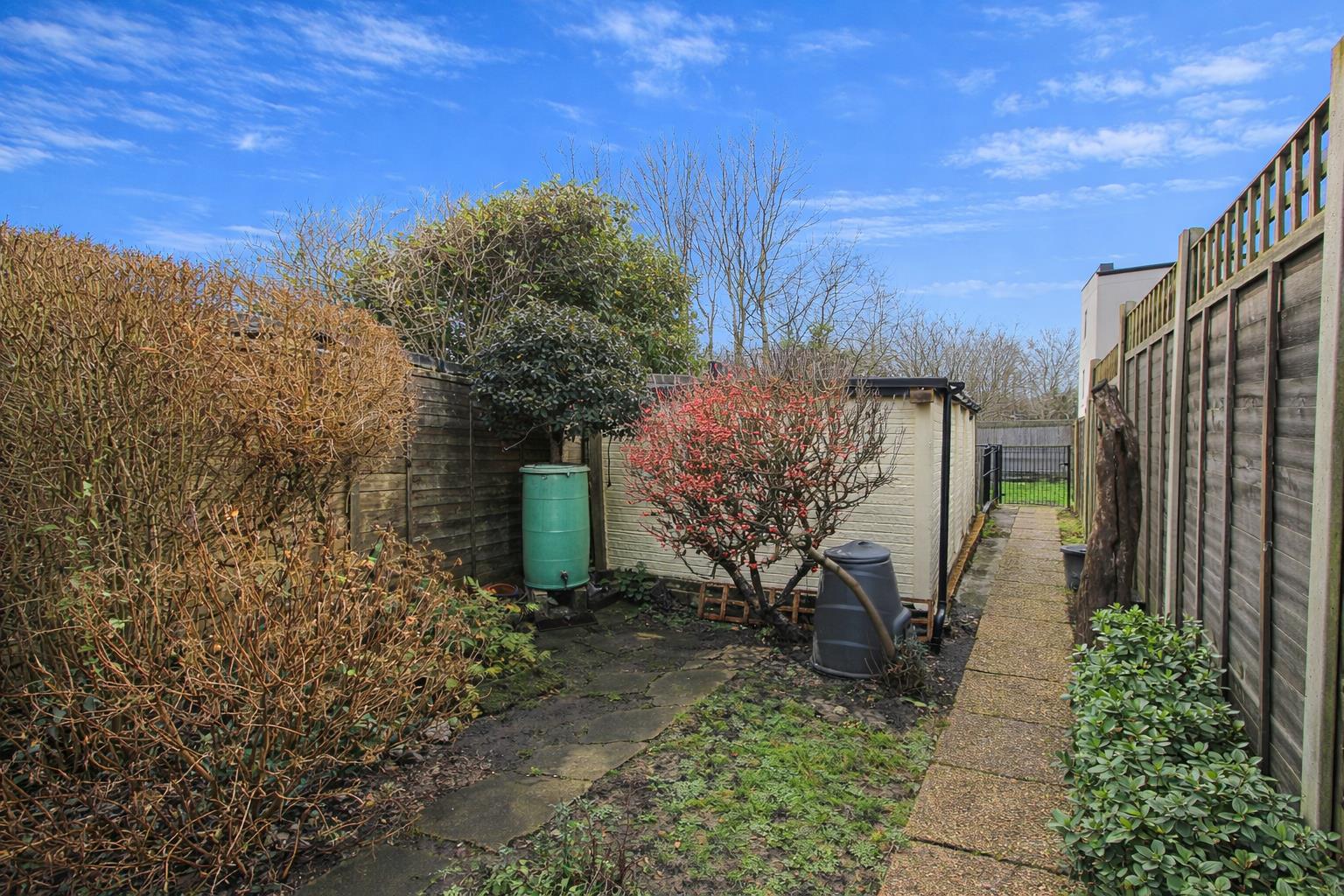 Paved patio area and footpath to rear, mainly laid to lawn with mature shrubs bordering, outside tap, fence enclosed, gated rear access.