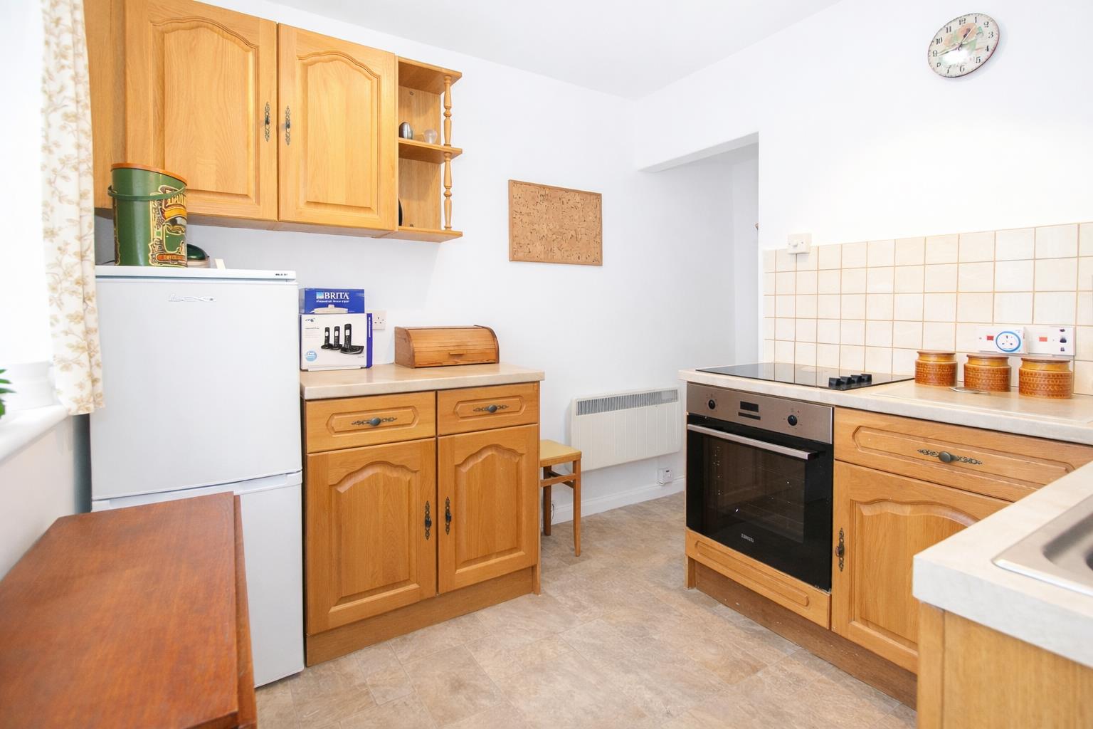 Range of fitted wooden wall units with matching cupboards and drawers below, roll top work surfaces with inlaid stainless steel sink and chrome mixer tap, inlaid hob with oven/grill below, integrated washing machine, space for tall standing fridge/freezer, tiled splash back, UPVC double glazed window to rear aspect, access to garden, under stairs storage cupboard