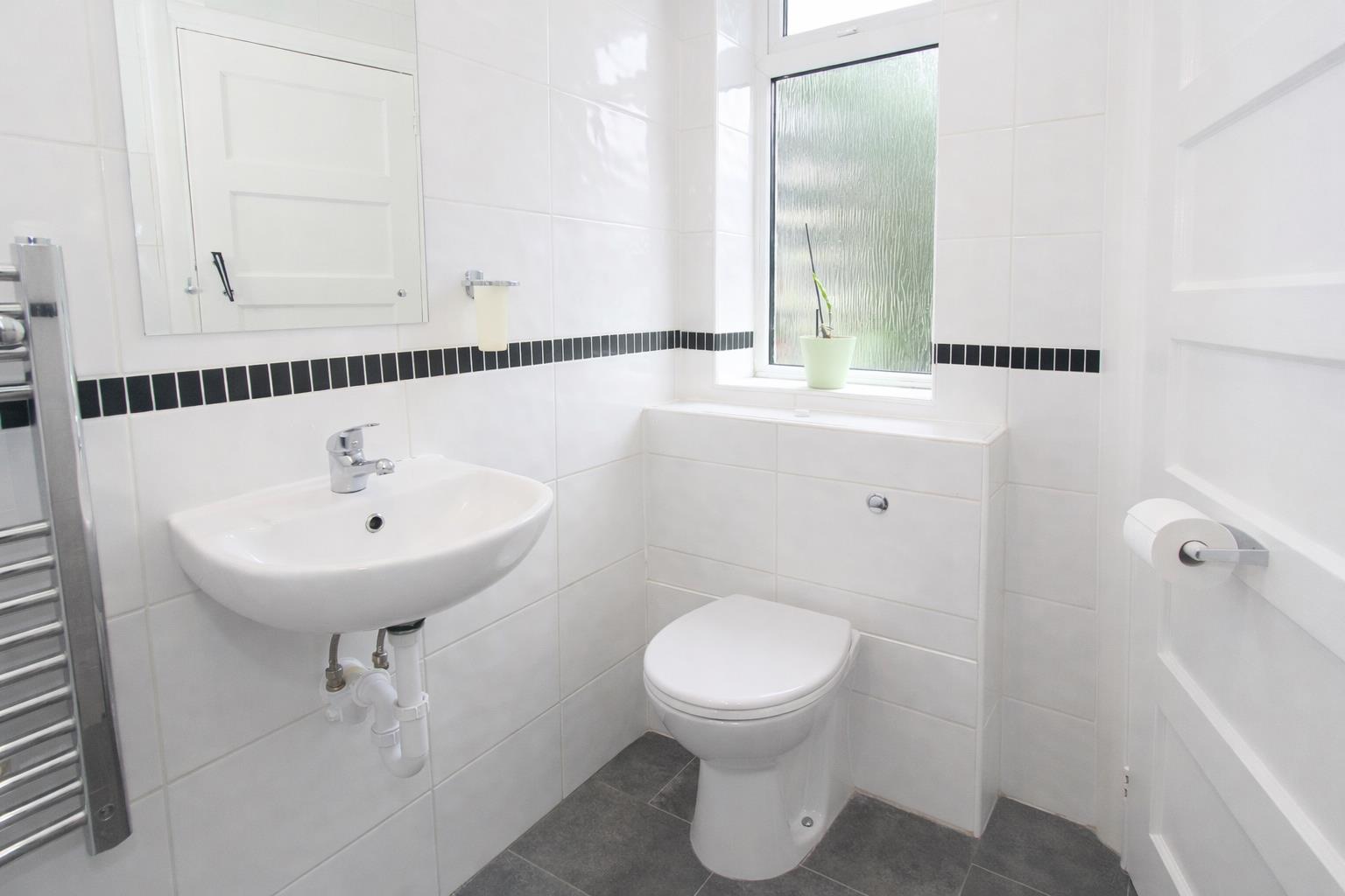 Consisting of tiled cubicle with thermostatic power shower, wash hand basin with chrome mixer tap, low-level push button flush WC, storage cupboard housing water tank, tiled effect flooring, heated chrome towel rail, tiled walls, obscure UPVC double glazed window to rear aspect.