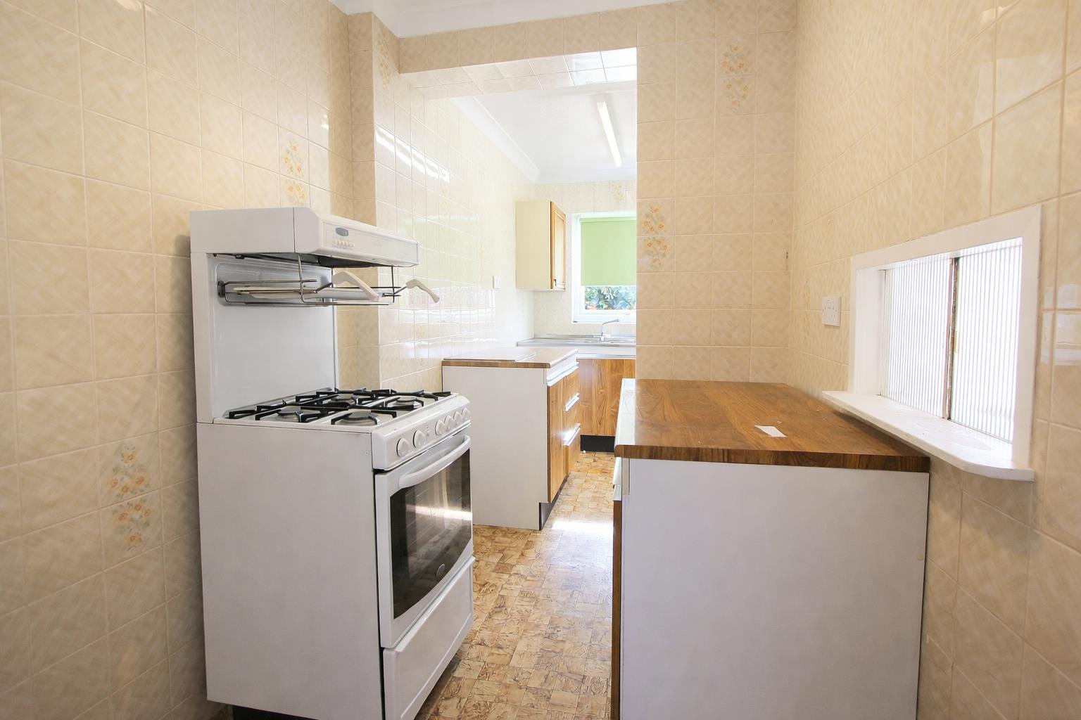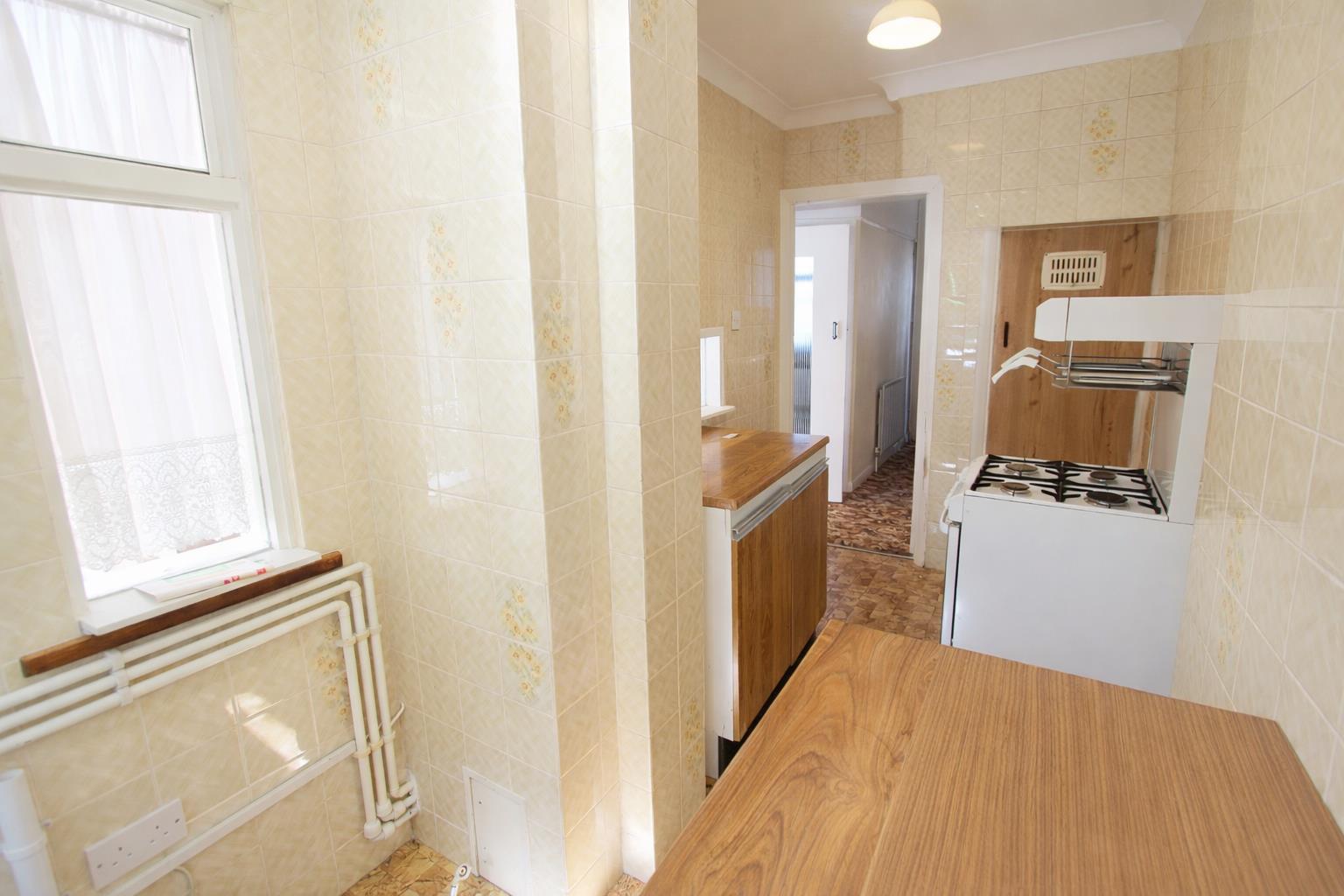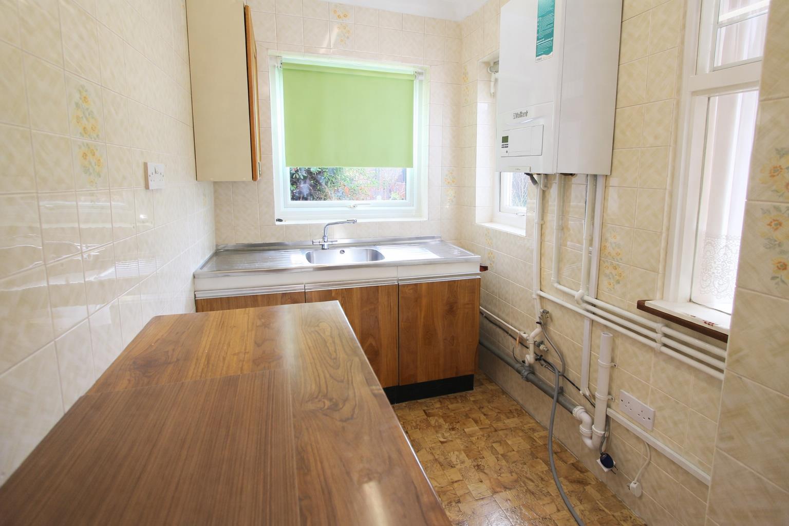 Range of fitted wooden wall units with cupboards and drawers below, stainless steel sink unit with chrome mixer tap, space for cooker, wall mounted boiler, space and plumbing for washing machine, UPVC double glazed windows to side and rear aspects.