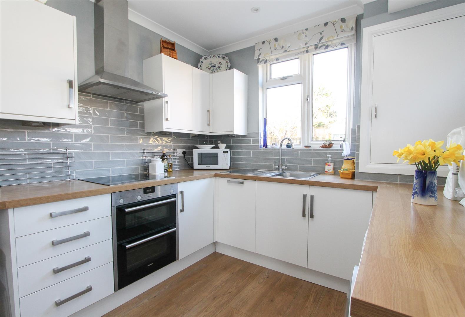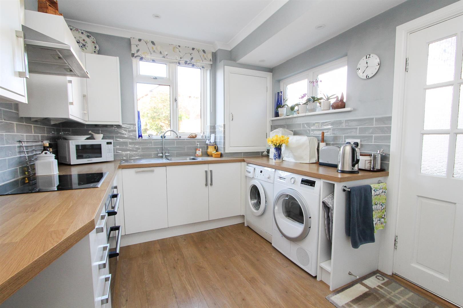 Side through access, range of fitted cupboard and wall units, stainless steel sink with chrome mixer tap, space and plumbing for washing machine/tumble dryer or extra fridge freezer, skylight, laminate flooring.