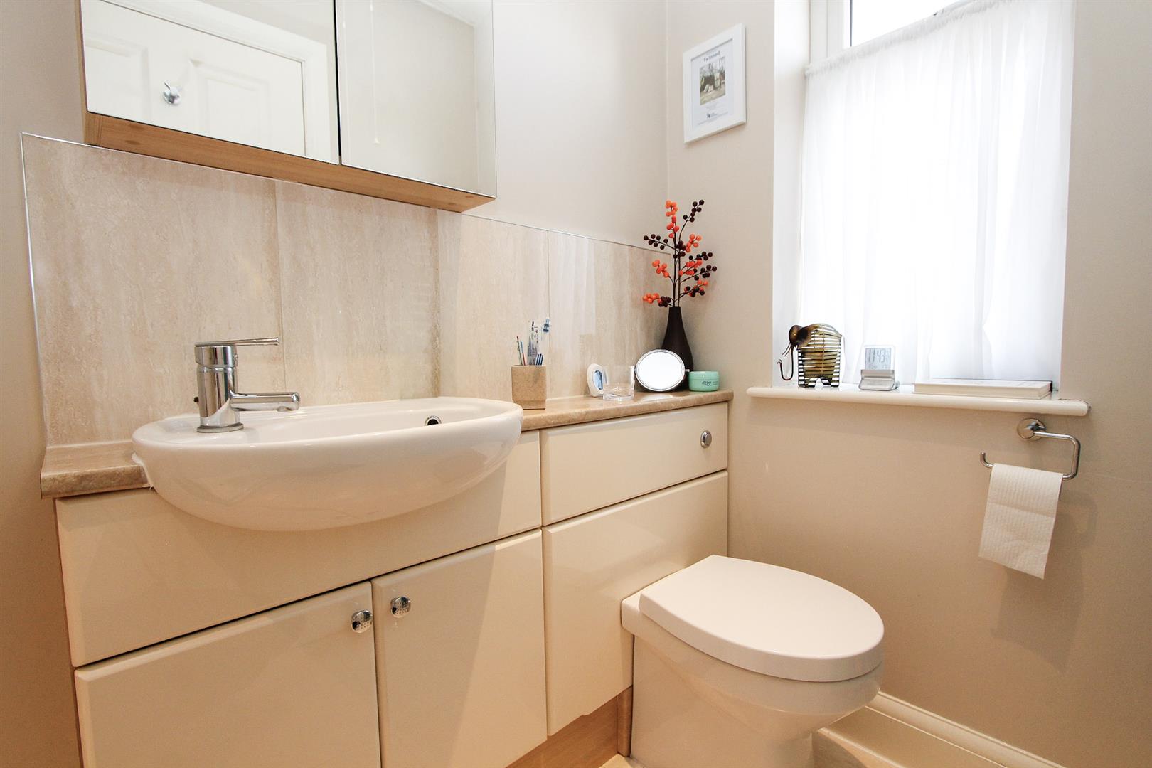 Shower cubicle with sliding door, thermostatic shower, vanity wash hand basin with chrome mixer tap and storage below, enclosed WC, heated chrome towel, part tiled walls, tiled flooring, double glazed obscure window to front aspect.