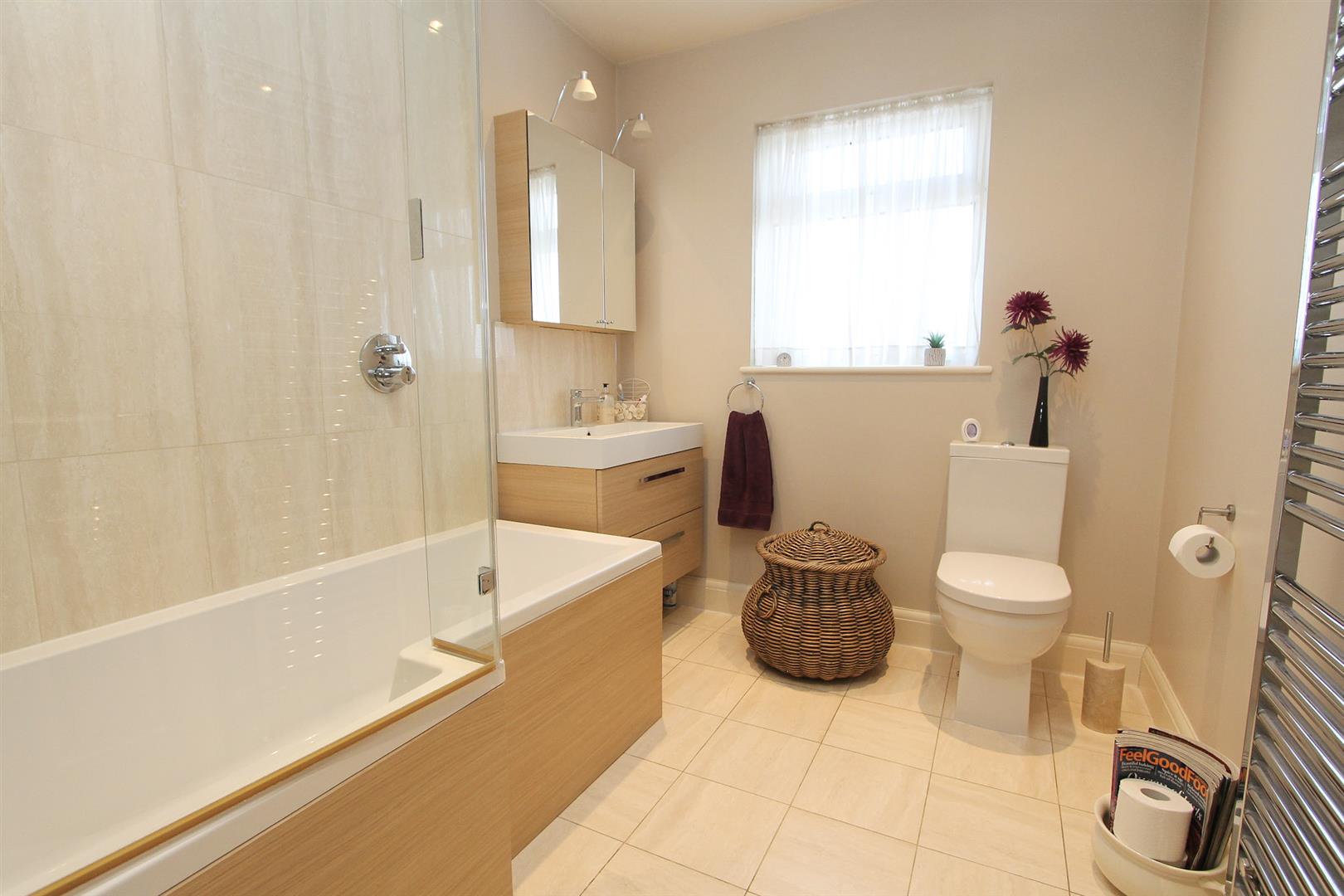 Modern three-piece suite comprising of panel enclosed bath with shower screen, thermostatic shower with wall mounted controls, vanity wash hand basin with chrome mixer tap and storage below, mirrored storage cabinet, WC, heated chrome towel rail, part tiled walls, tiled flooring, extractor fan, UPVC double glazed obscure window to front aspect.
