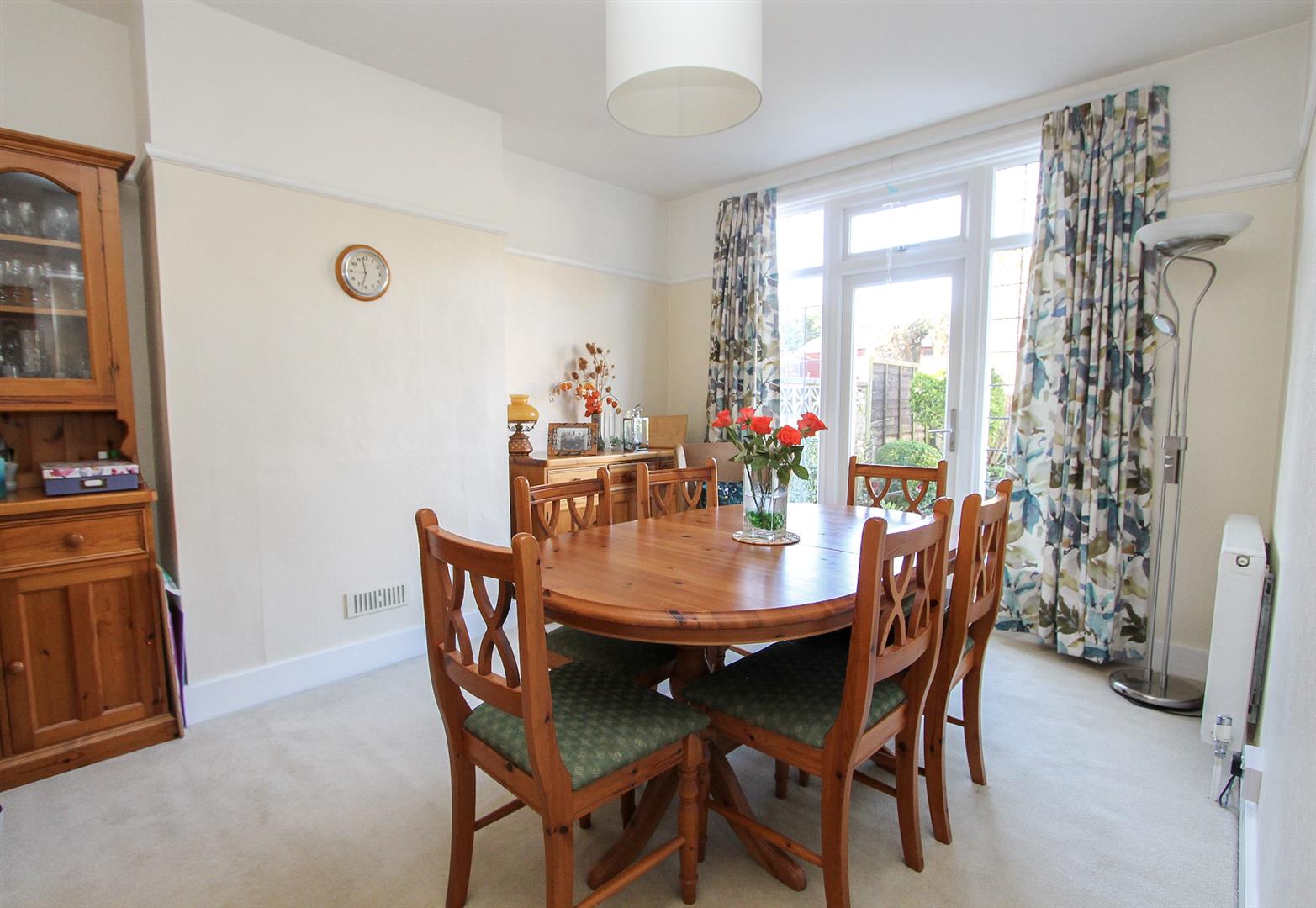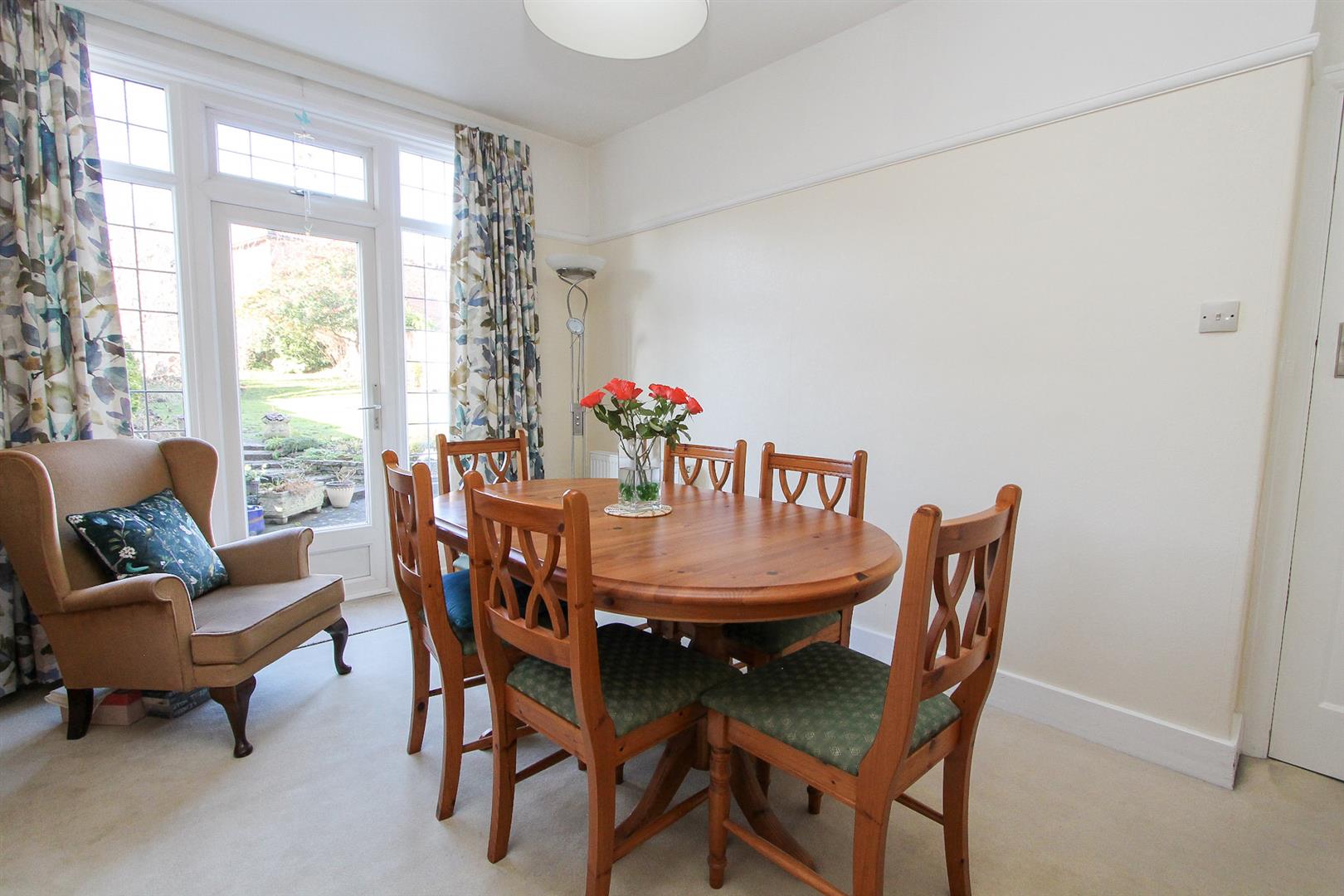 Radiator, fitted carpet, UPVC double glazed leaded light windows and patio door leading out to garden .