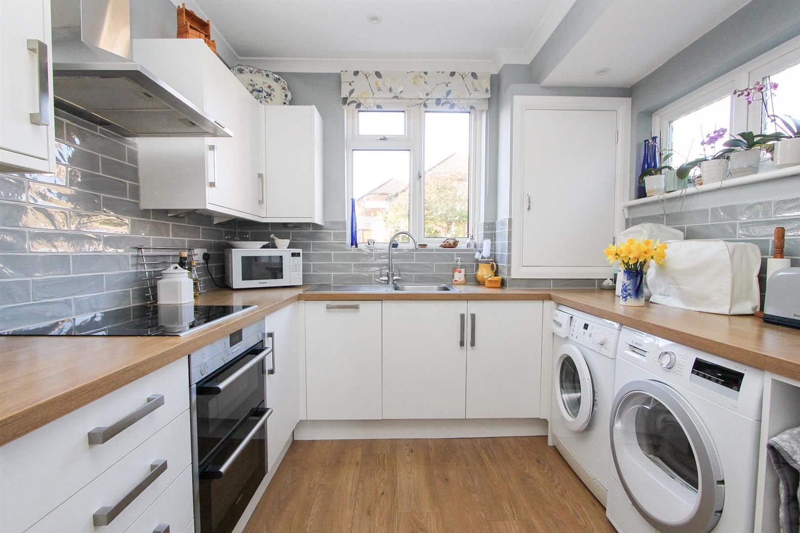 Range of modern white fitted kitchen units and drawers, laminate worktop, inset stainless steel sink with chrome mixer tap, integrated oven/grill, electric hob and chrome extractor hood above, space for fridge freezer, washing machine and tumble dryer, tiled splashback, cupboard housing 'Worcester' boiler, UPVC double glazed window to rear aspect, UPVC double glazed obscure window to side aspect, part glazed door providing side access, laminate flooring.