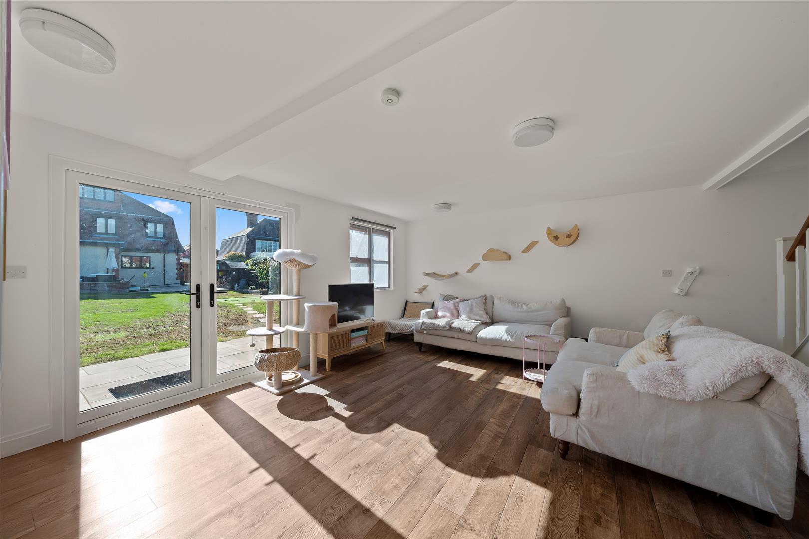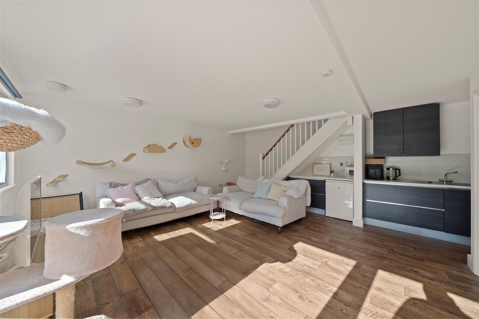 UPVC double glazed window to side aspect and patio doors to rear, feature skylight, engineered oak flooring and fitted storage cupboard, coved ceiling, feature cast iron radiator.