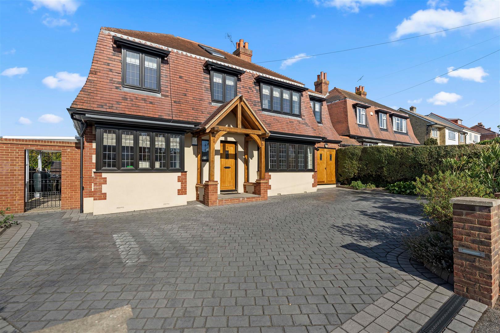 Block paved driveway providing off street parking for several vehicles, raised flowerbeds at side and brick wall border.
