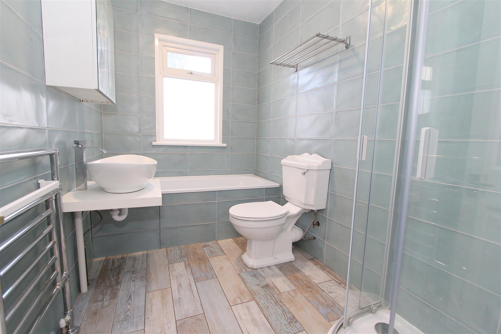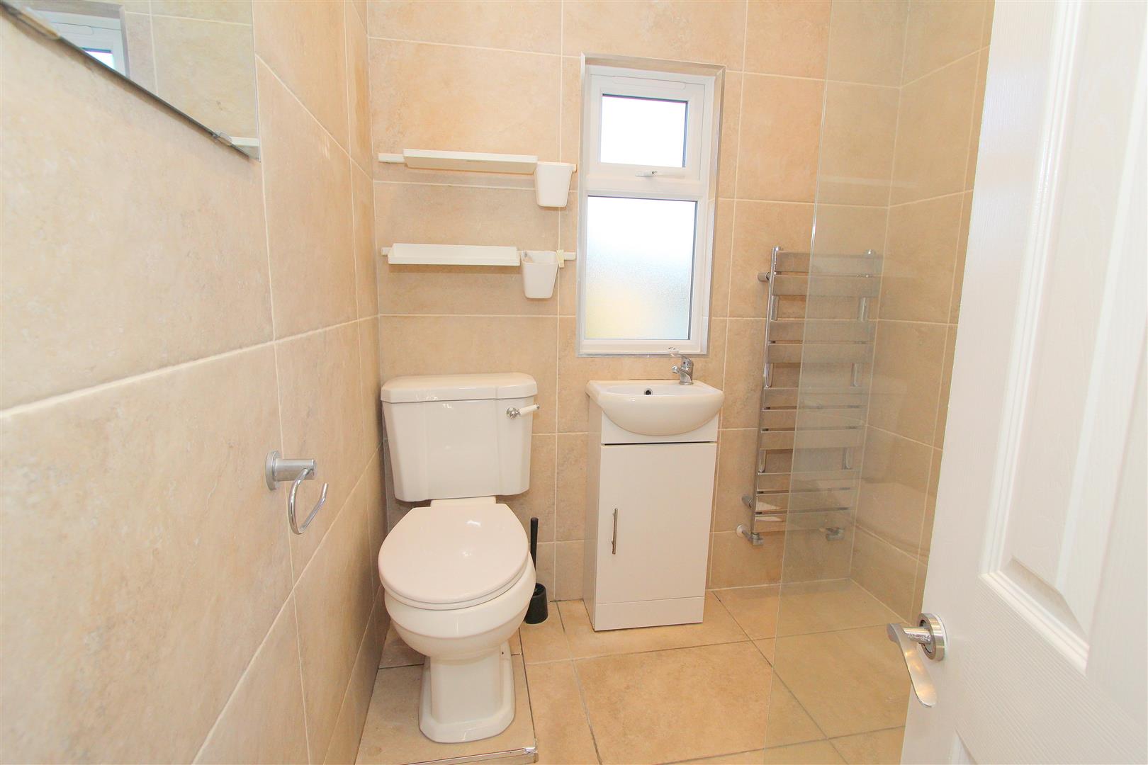 Consisting of tiled walk in cubicle with thermostatic shower and hand attachment, wash hand basin with chrome mixer tap and storage cupboard below, low-level flush WC, heated chrome towel rail, tiled flooring, tiled walls, obscure UPVC double glazed window to rear aspect.