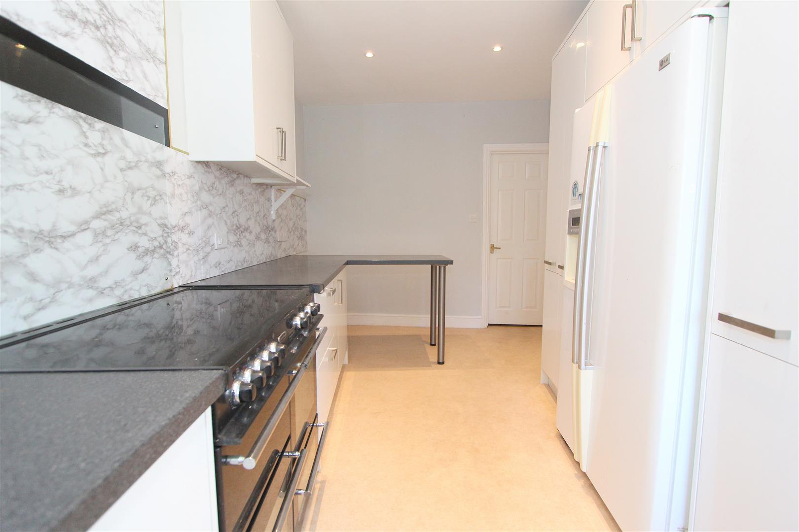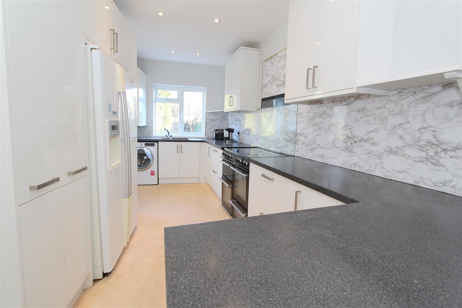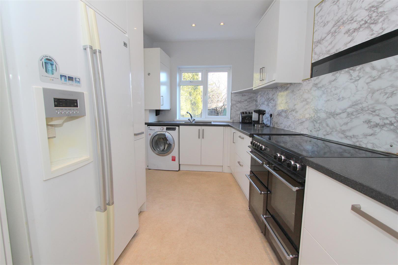 Range of fitted wall units with matching cupboards and drawers below, granite effect roll top works surfaces with inlaid sink and chrome mixer tap, cupboard housing “Worcester” boiler, space and plumbing for washing machine, space for large gas range cooker, space for American style fridge/freezer, breakfast bar area, single panel radiator, marble effect splash back, UPVC double glazed window to rear aspect and door leading to garden.