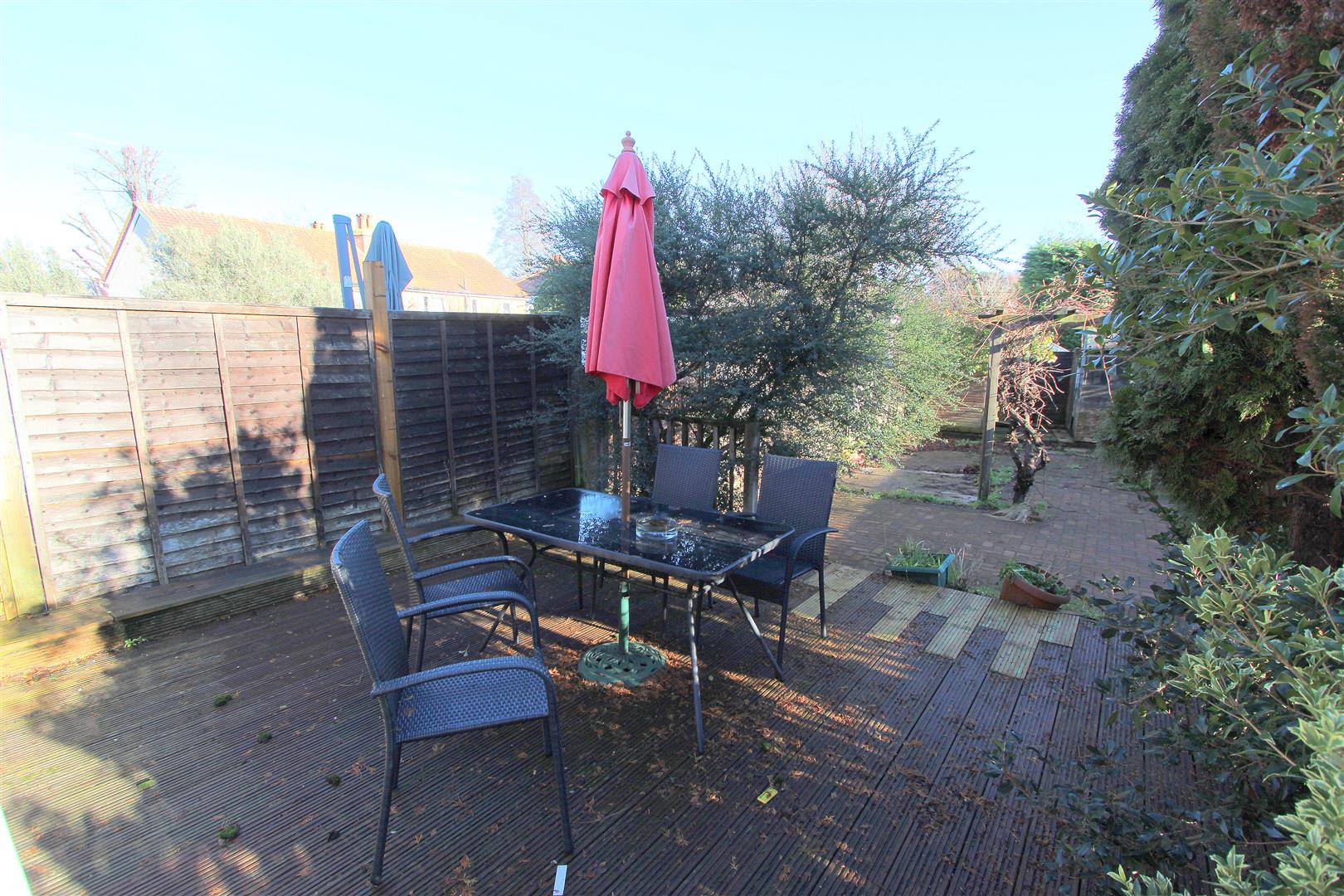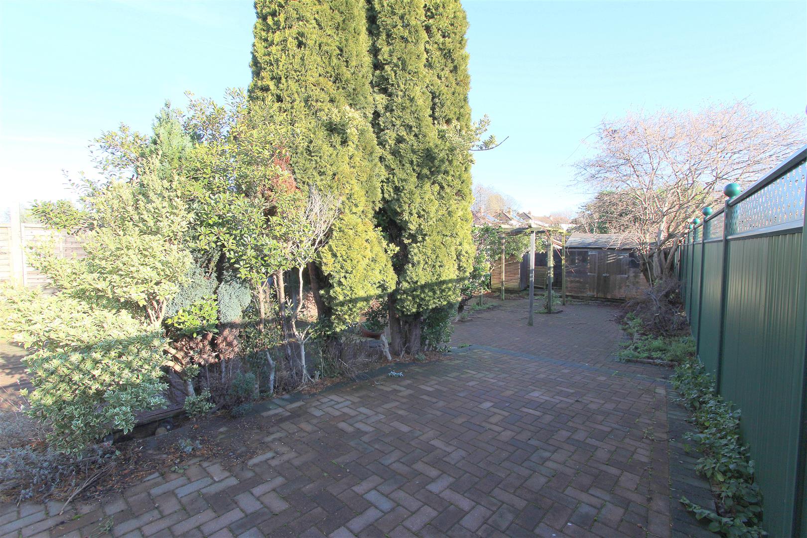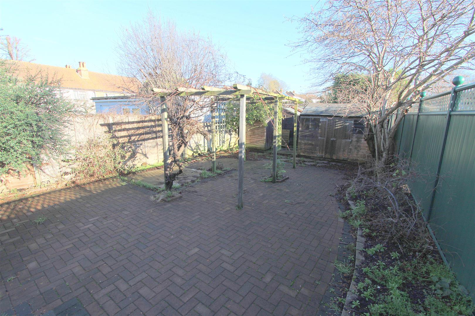 Decking area with block paved patio at side and rear, pergola, two garden sheds, fence enclosed, gated side access, outside tap.