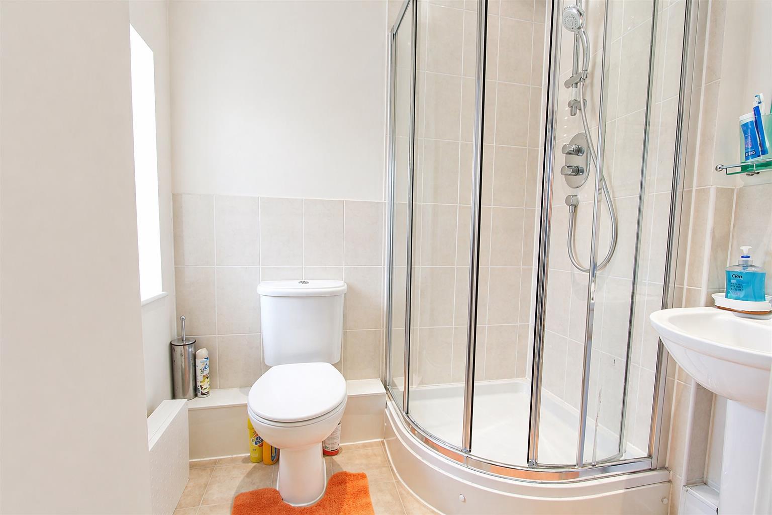 Neutral-coloured lino flooring, it includes a curved shower cubicle with glass doors and a chrome mixer shower, chrome heated towel rail, wall-mounted sink with a chrome mixer tap, with a mirror above, a window is positioned on the left-hand wall, the walls are finished with neutral tiles and cream walls.
