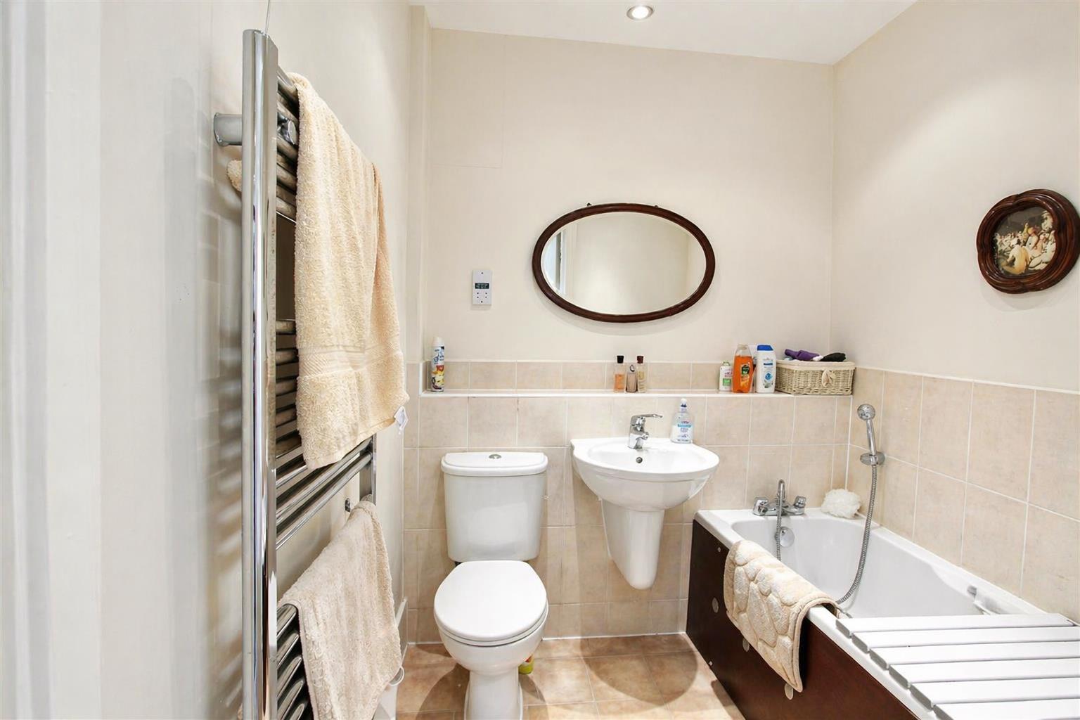 Neutral-coloured lino flooring, heated chrome towel rail, a wall-mounted Ideal Standard sink with a chrome mixer tap, and a wall-mounted WC, the bath is fitted with a chrome mixer tap and a separate showerhead attachment, neutral-coloured tiles are installed midway up the walls, with beige-painted walls above, the ceiling is fitted with spotlights.