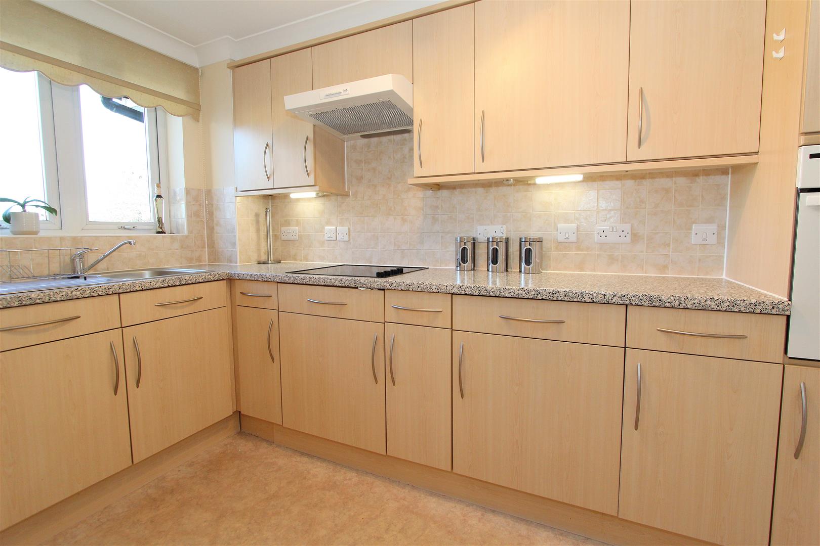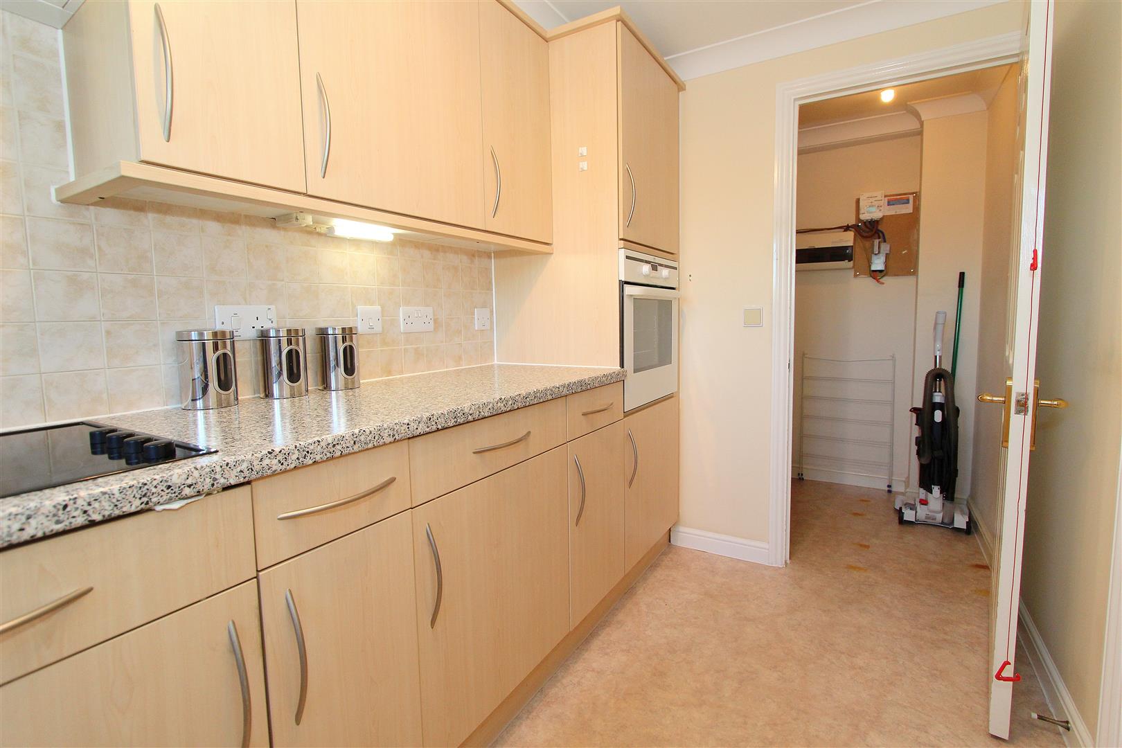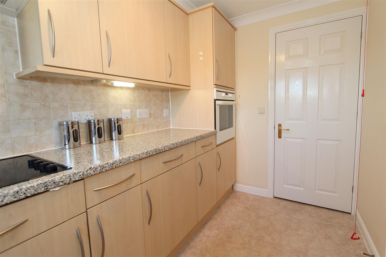 Range of fitted wall units with matching cupboards and drawers below, roll top work surfaces with inlaid stainless steel sink and chrome mixer tap, inlaid hob with extractor fan above, integrated freezer/freezer, integrated oven/grill, wall mounted heater, UPVC double glazed window to side aspect overlooking well kept communal grounds, large storage cupboard with fitted shelving, wall mounted emergency alarm cord.