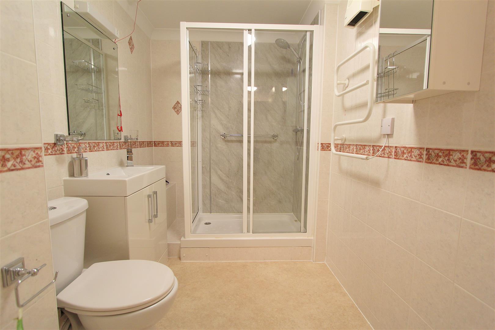 Consisting of panelled cubicle with thermostatic shower, wash hand basin with chrome mixer tap and storage cupboards below, low-level push button flush WC, heated towel rail, wall mounted heater, extractor fan, shaver point, tiled walls, coved ceiling, wall mounted emergency alarm cord.
