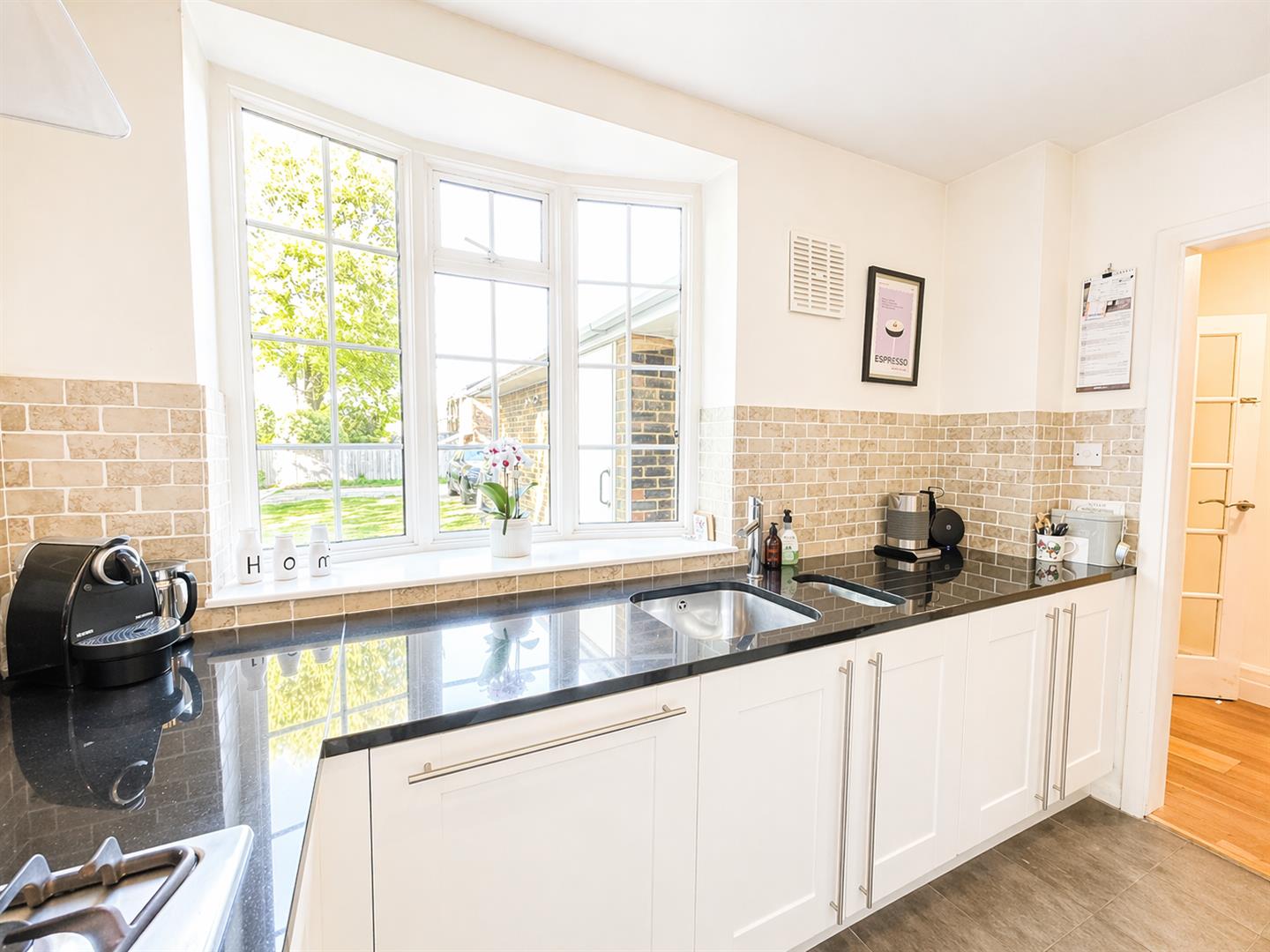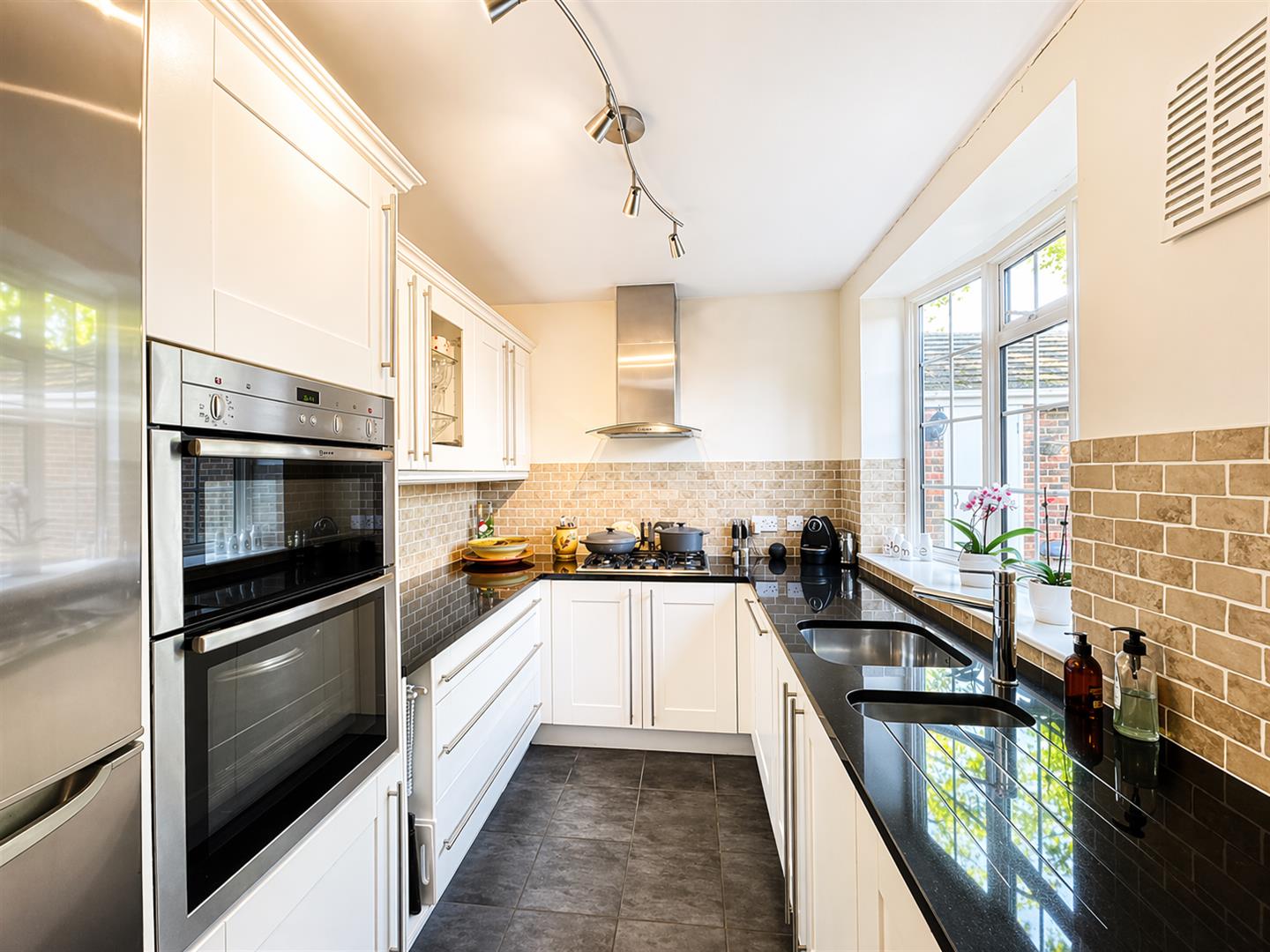 UPVC double glazed Georgian bay window, tiled flooring, a range of matching shaker style cupboards and drawers below, black granite work surfaces, integrated Neff electric double oven, stainless steel gas hob, built in stainless steel extractor fan, integrated Neff dishwasher, space for fridge freezer, stainless steel 1 1/2 bowl sink with mixer tap