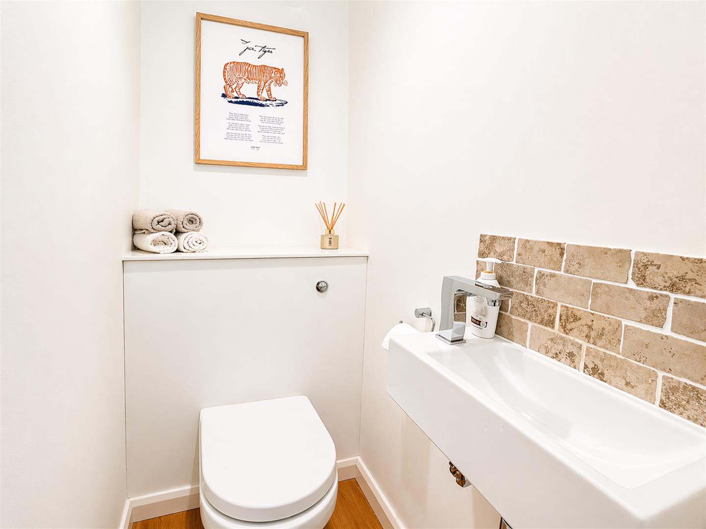 WC with concealed push button cistern, wash hand basin with chrome taps, tiled splash back