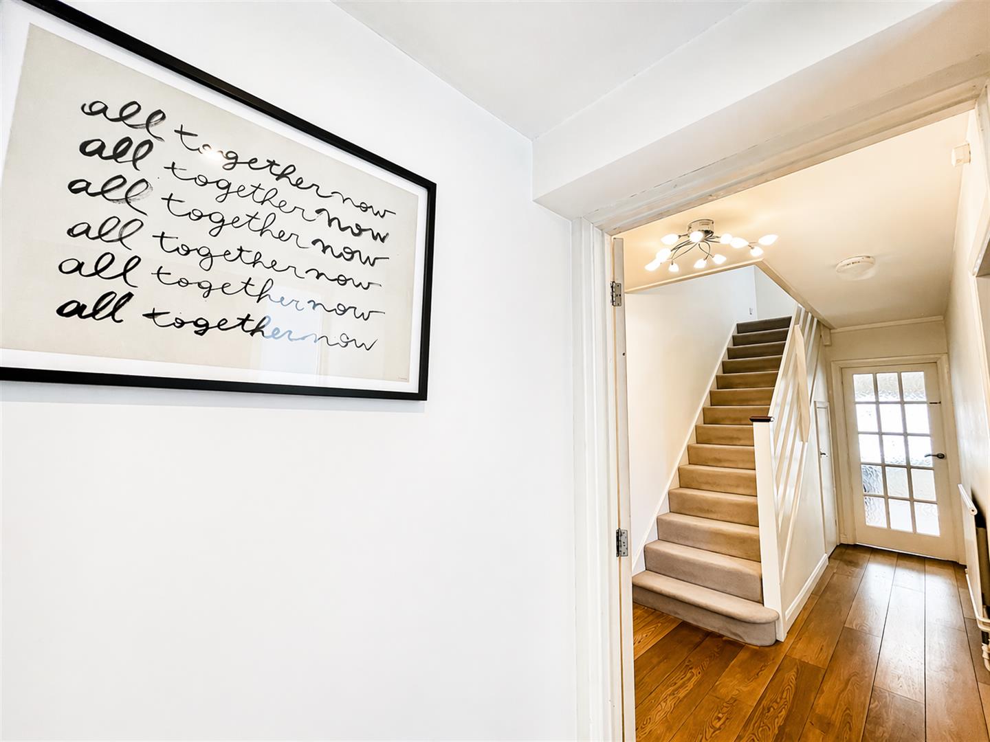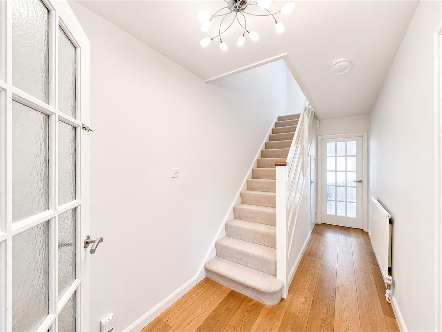 Door to wc, under stairs cupboard, radiator, solid wood oak flooring, door to kitchen, lounge