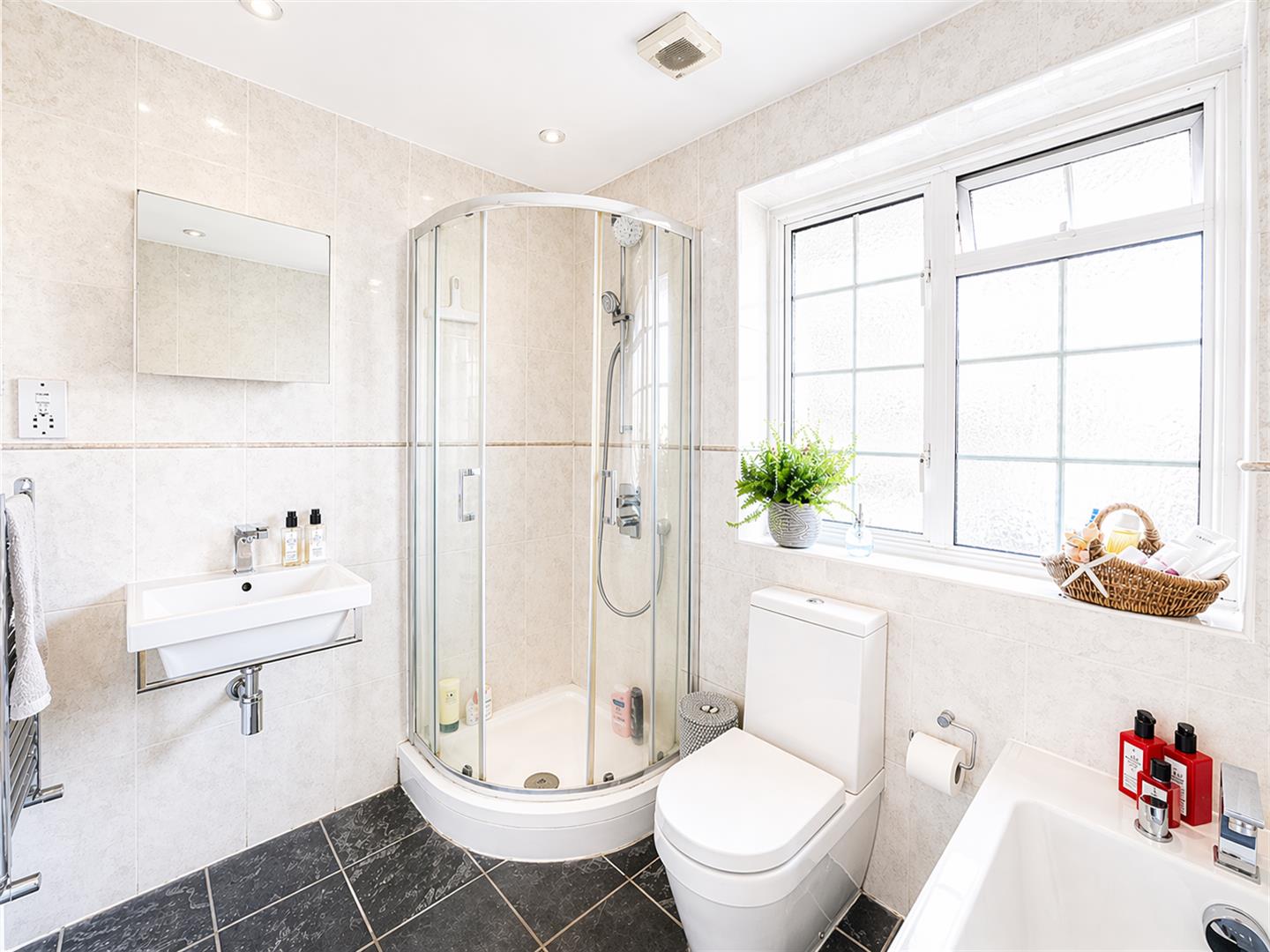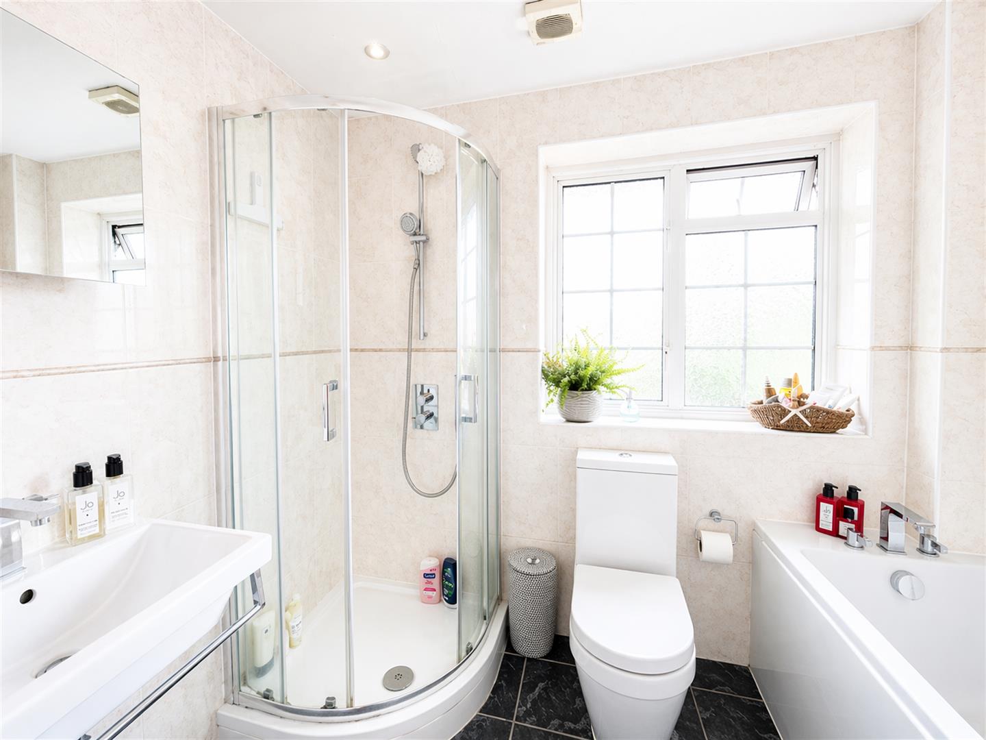 Four piece bathroom suite, fully tiled walls, wall mounted mirror, tiled floor, chrome heated towel rail, enclosed shower cubicle with chrome fittings, ceramic hand basin with mixer tap, wc, bath with chrome tap